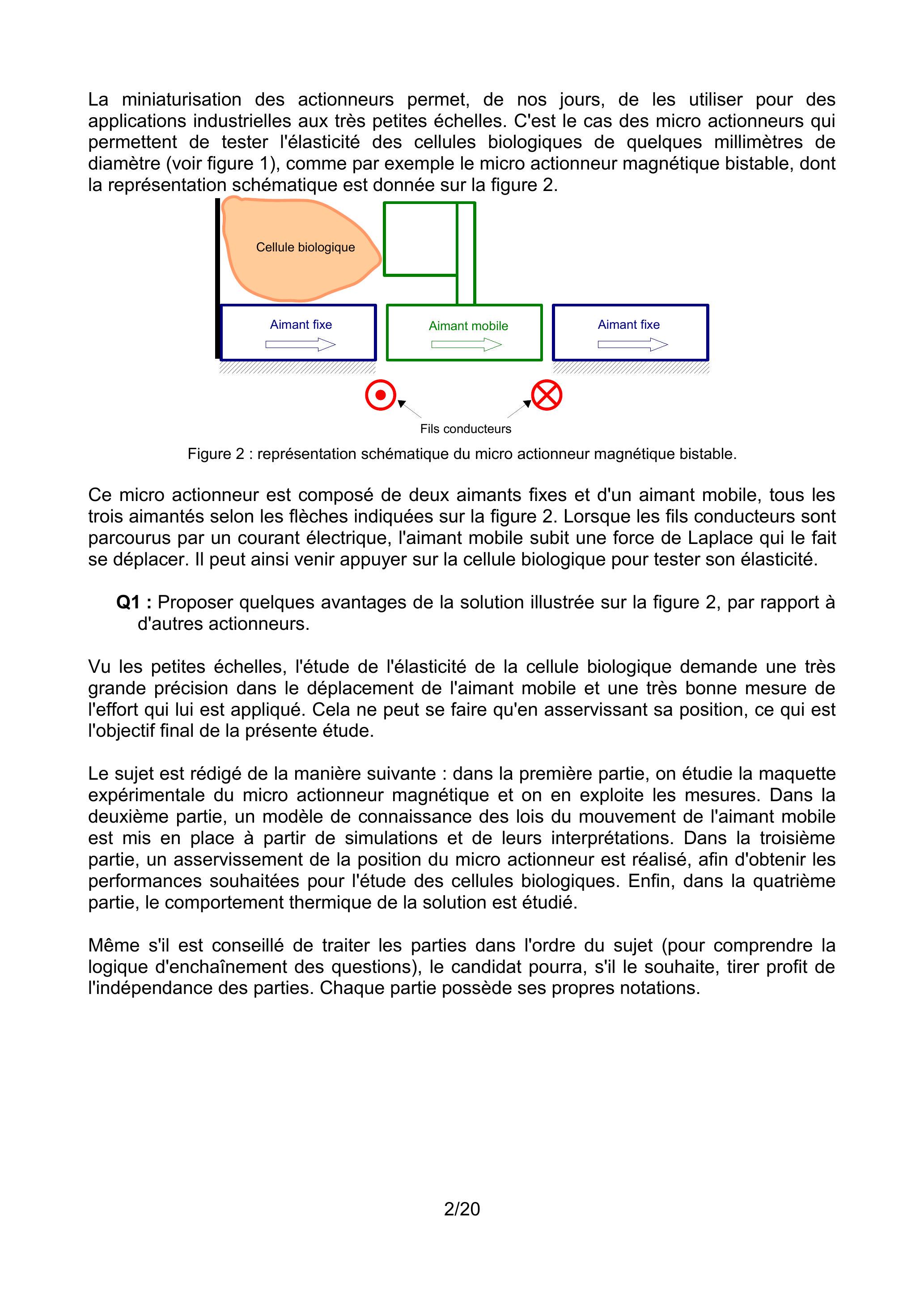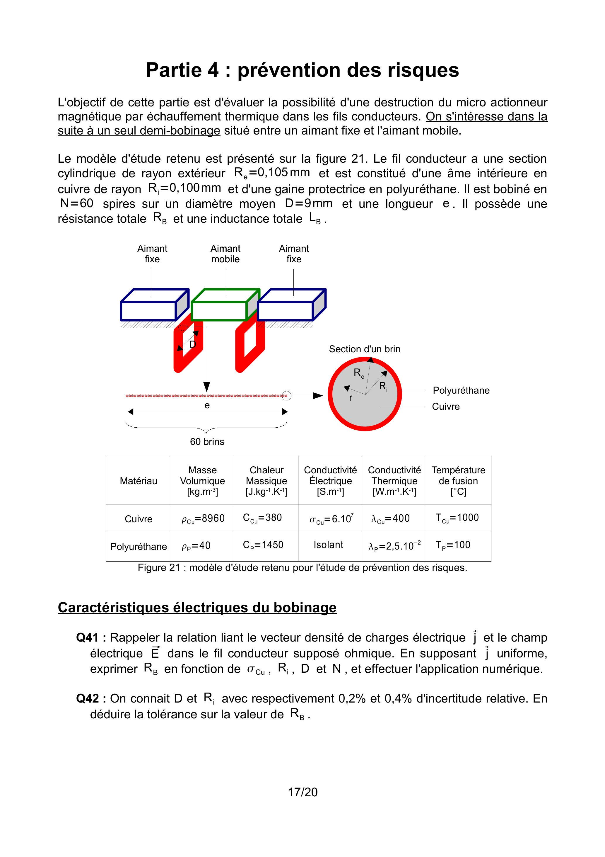 Q52 : En pratique, il faut envoyer une intensité de 12 A sur une durée d'au plus 50 ms au démarrage pour avoir effectivement un décollage. Justifier la cohérence de cette valeur par rapport à la question précédente et à la question 50 . Calculer l'énergie dissipée par effet Joule lors de cet amorçage si . Indiquer la précaution qu'il faudrait prendre entre deux impulsions pour éviter une destruction précoce du bobinage au démarrage du micro actionneur magnétique.
