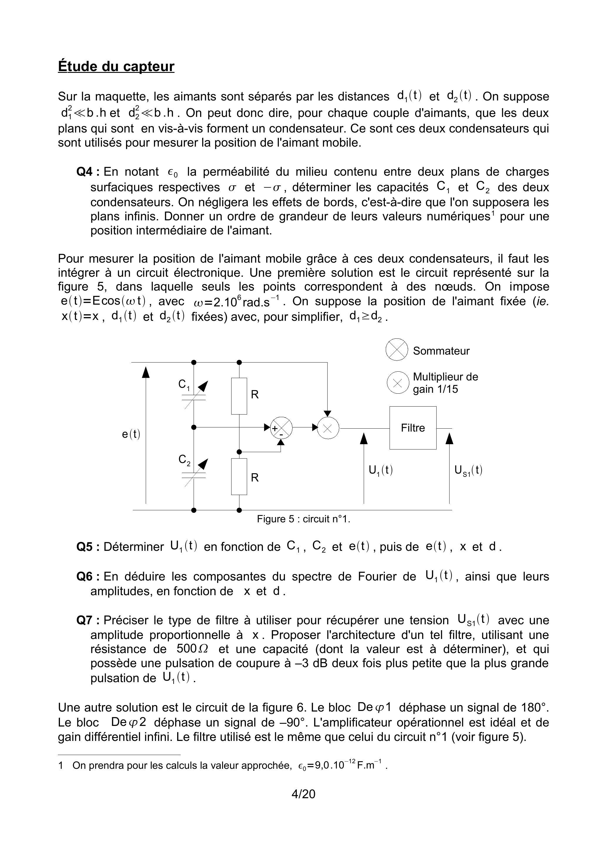 Pour mesurer la position de l'aimant mobile grâce à ces deux condensateurs, il faut les intégrer à un circuit électronique. Une première solution est le circuit représenté sur la figure 5, dans laquelle seuls les points correspondent à des nœuds. On impose , avec rad.s . On suppose la position de l'aimant fixée (ie. et fixées) avec, pour simplifier, .