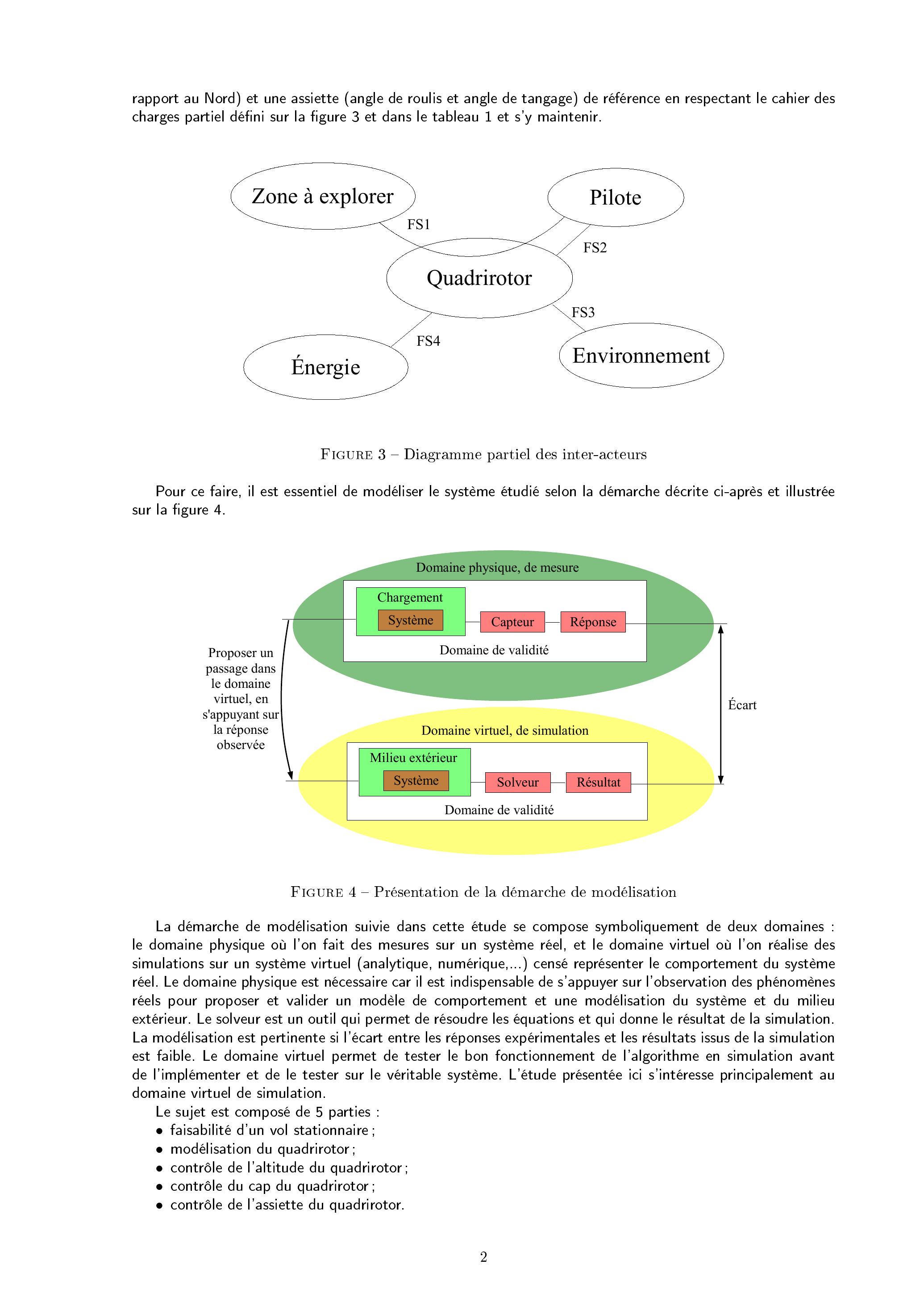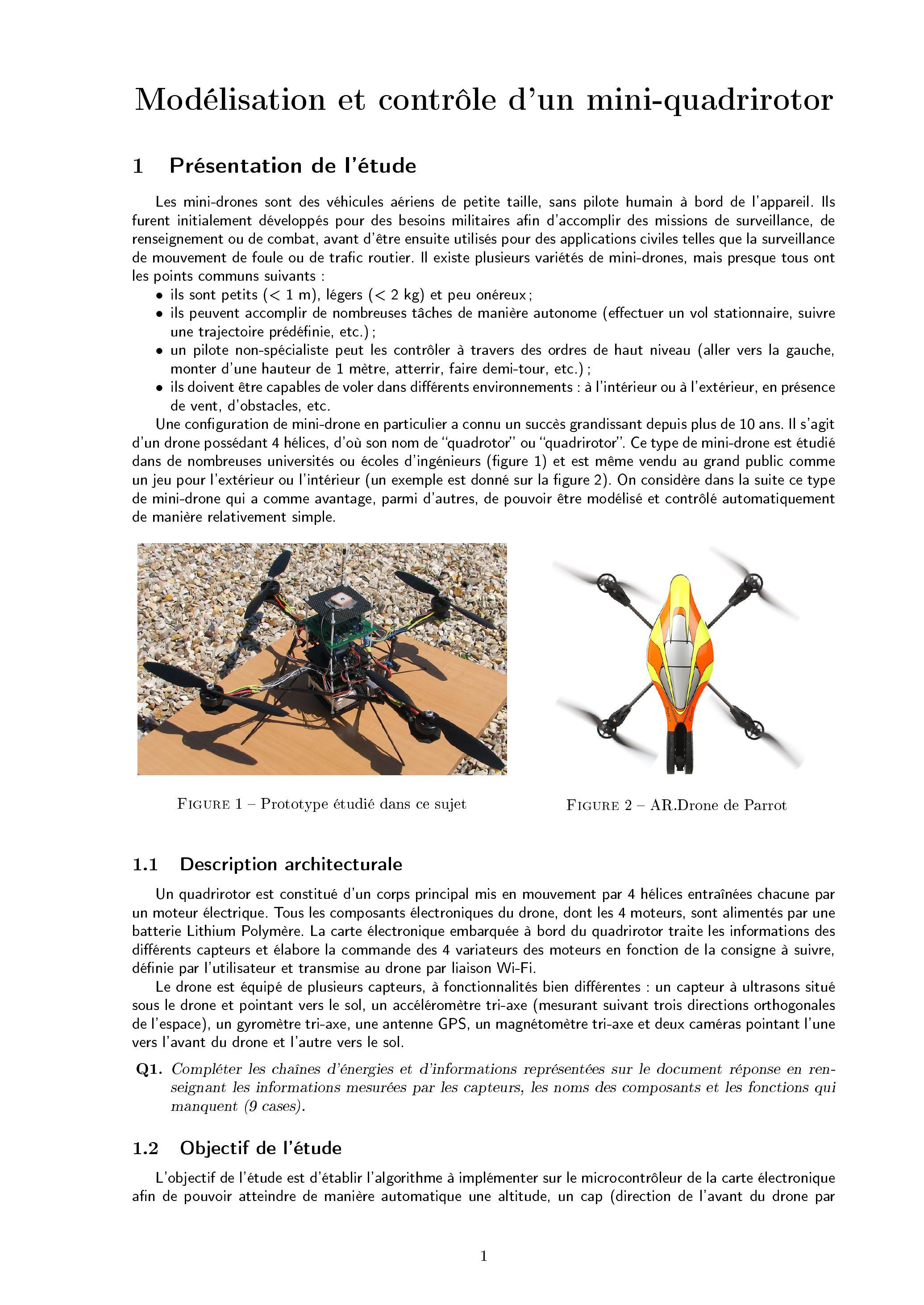 Une configuration de mini-drone en particulier a connu un succès grandissant depuis plus de 10 ans. Il s'agit d'un drone possédant 4 hélices, d'où son nom de "quadrotor" ou "quadrirotor". Ce type de mini-drone est étudié dans de nombreuses universités ou écoles d'ingénieurs (figure 1) et est même vendu au grand public comme un jeu pour l'extérieur ou l'intérieur (un exemple est donné sur la figure 2). On considère dans la suite ce type de mini-drone qui a comme avantage, parmi d'autres, de pouvoir être modélisé et contrôlé automatiquement de manière relativement simple.