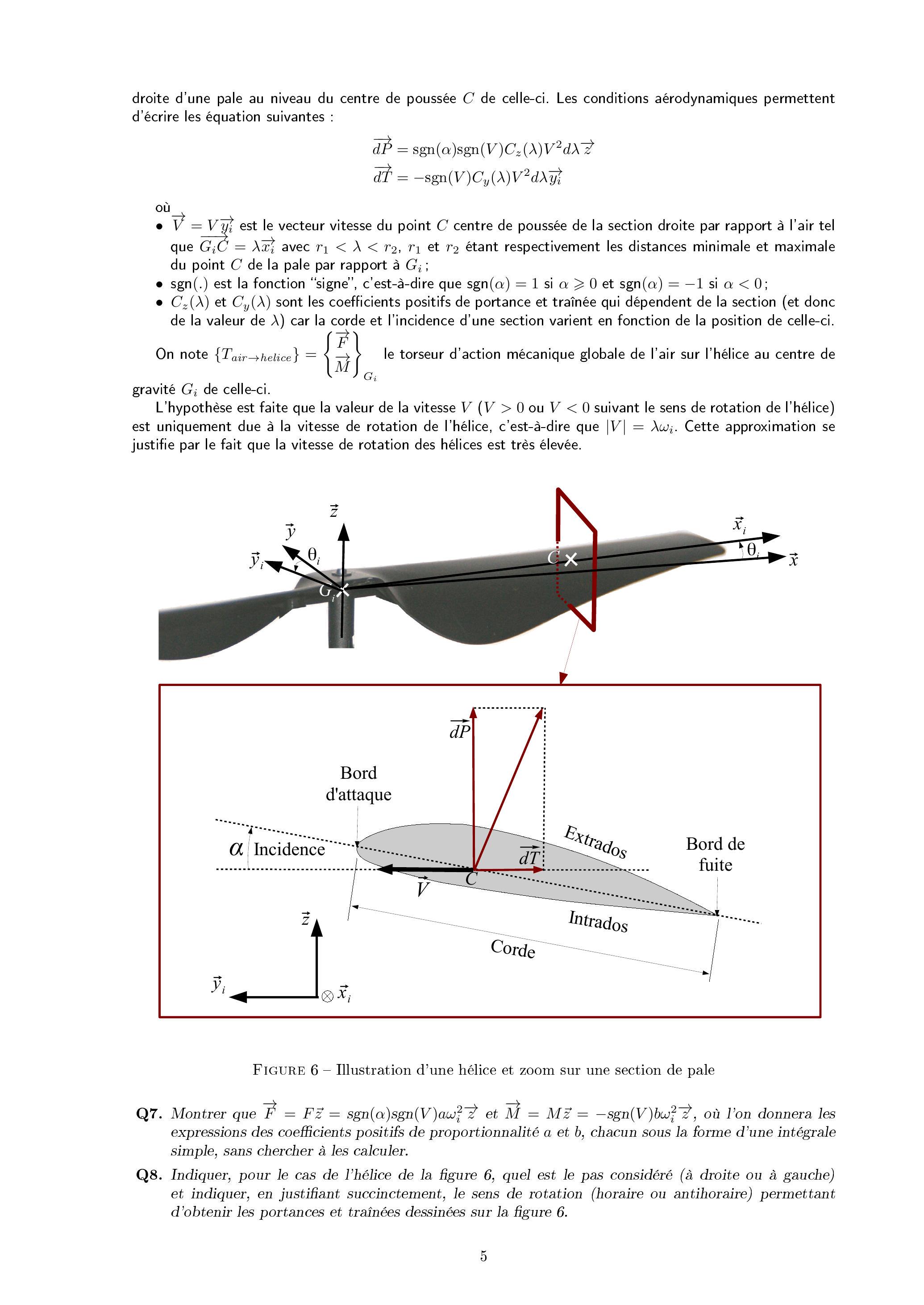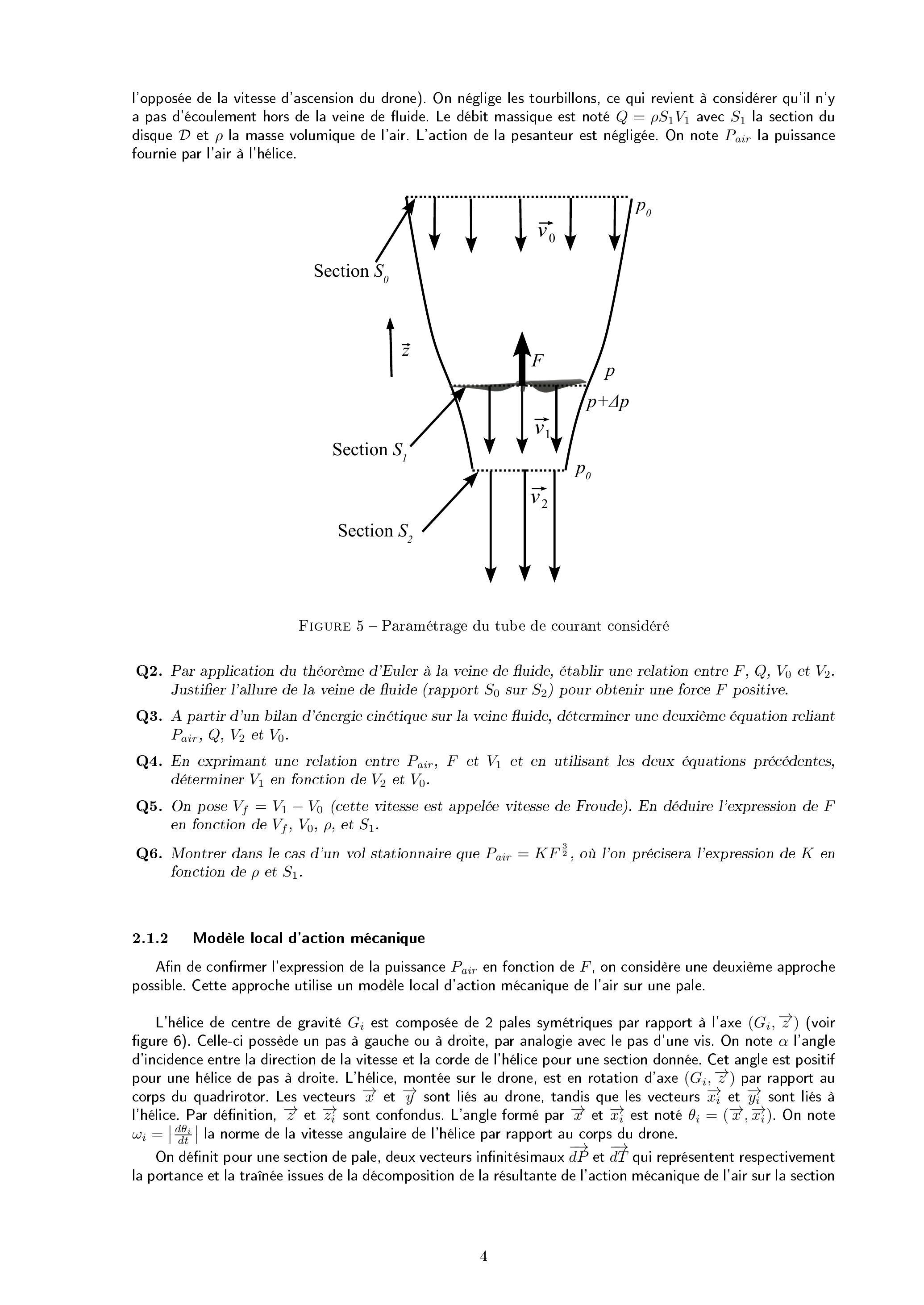 l'opposée de la vitesse d'ascension du drone). On néglige les tourbillons, ce qui revient à considérer qu'il n'y a pas d'écoulement hors de la veine de fluide. Le débit massique est noté avec la section du disque et la masse volumique de l'air. L'action de la pesanteur est négligée. On note la puissance fournie par l'air à l'hélice.