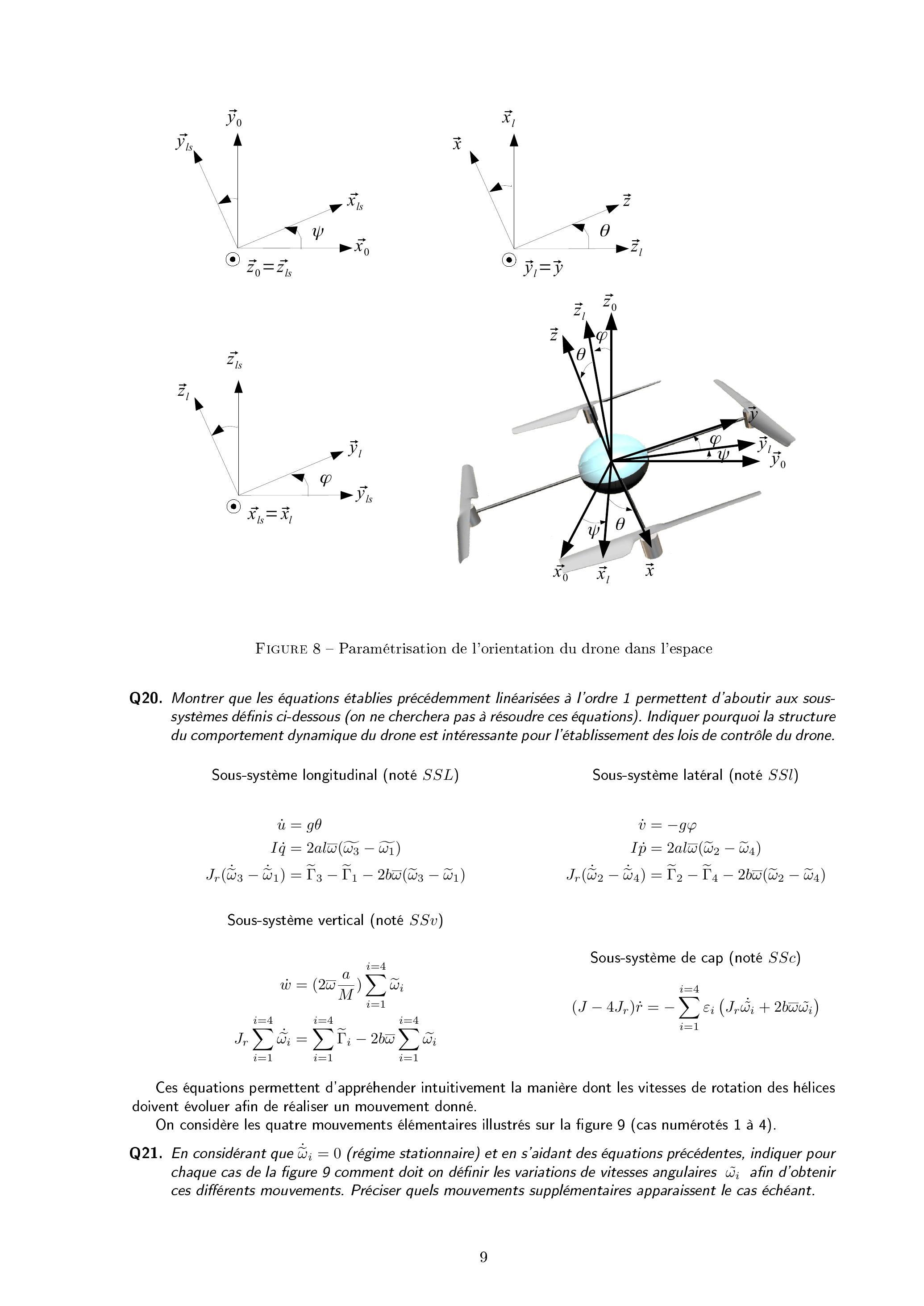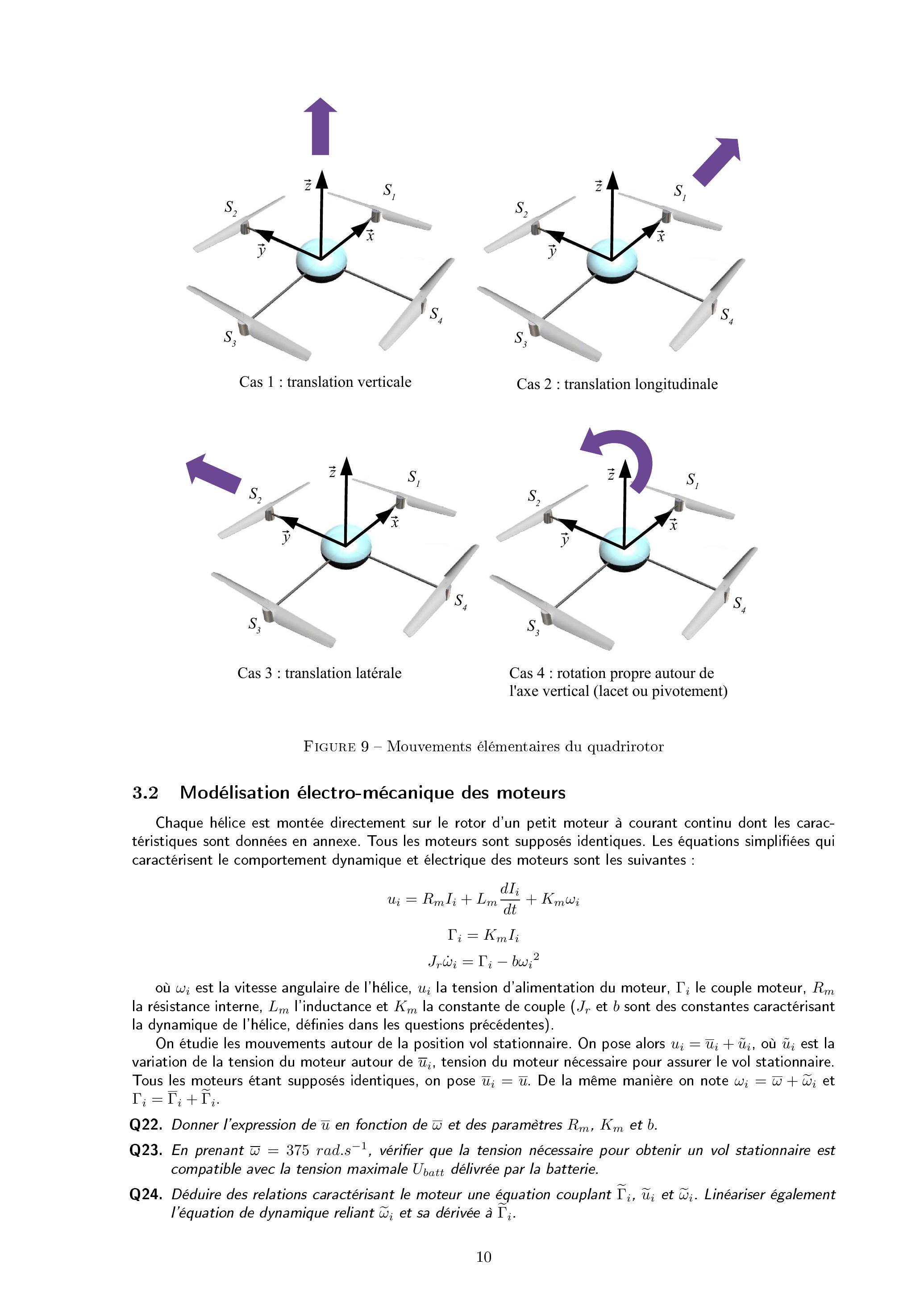 On étudie les mouvements autour de la position vol stationnaire. On pose alors , où est la variation de la tension du moteur autour de , tension du moteur nécessaire pour assurer le vol stationnaire. Tous les moteurs étant supposés identiques, on pose . De la même manière on note et .