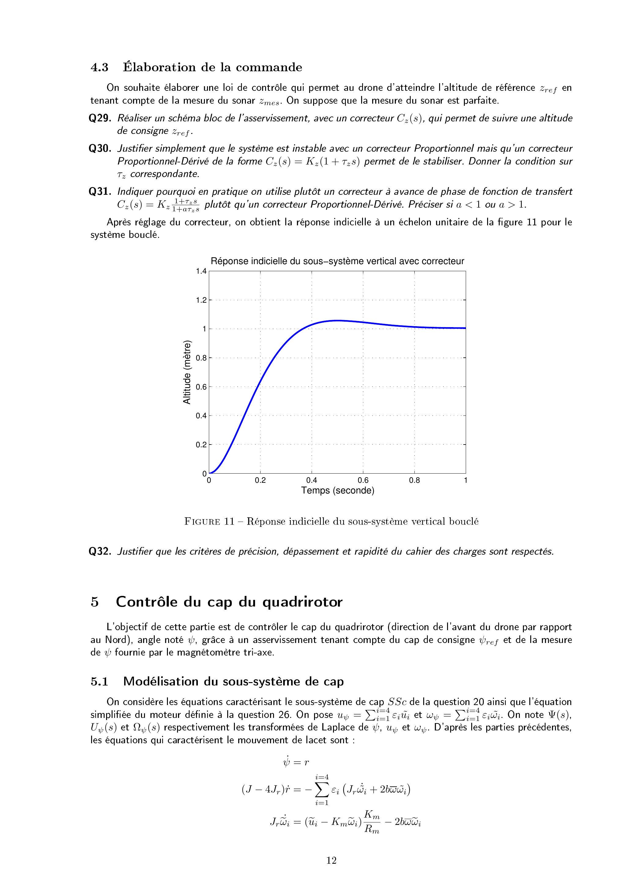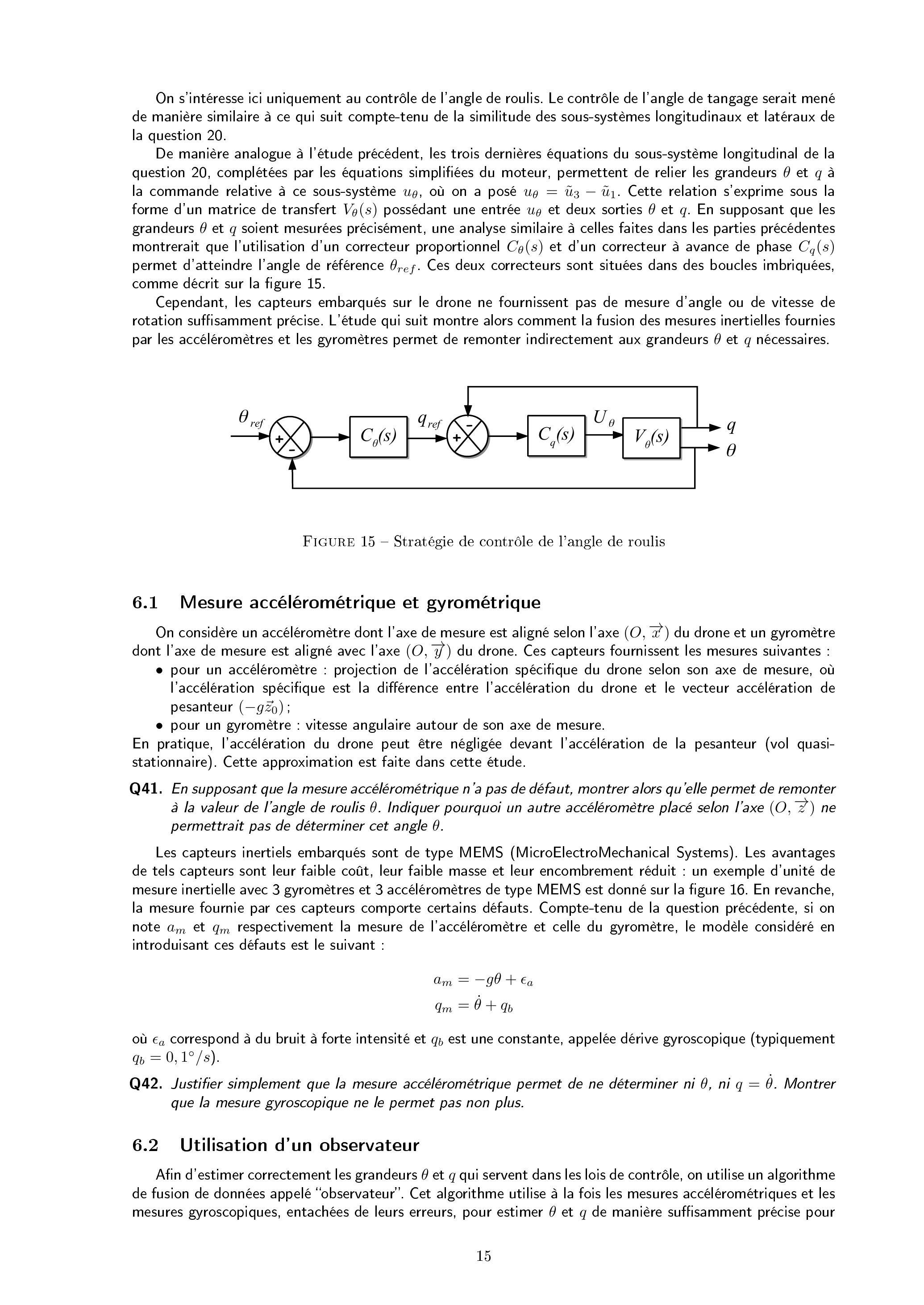 De manière analogue à l'étude précédent, les trois dernières équations du sous-système longitudinal de la question 20, complétées par les équations simplifiées du moteur, permettent de relier les grandeurs et à la commande relative à ce sous-système , où on a posé . Cette relation s'exprime sous la forme d'un matrice de transfert possédant une entrée et deux sorties et . En supposant que les grandeurs et soient mesurées précisément, une analyse similaire à celles faites dans les parties précédentes montrerait que l'utilisation d'un correcteur proportionnel et d'un correcteur à avance de phase permet d'atteindre l'angle de référence . Ces deux correcteurs sont situées dans des boucles imbriquées, comme décrit sur la figure 15.