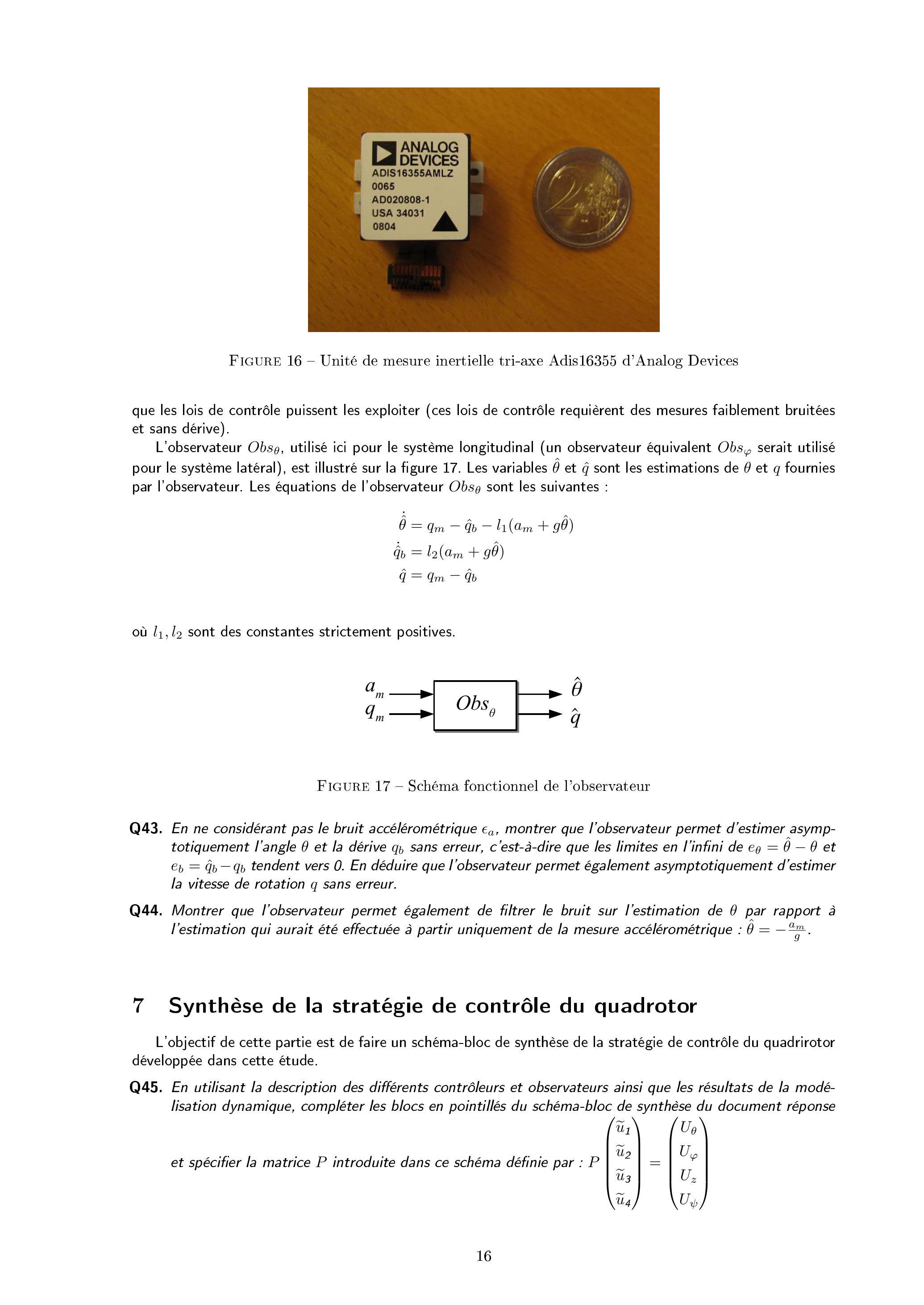 Afin d'estimer correctement les grandeurs et qui servent dans les lois de contrôle, on utilise un algorithme de fusion de données appelé "observateur". Cet algorithme utilise à la fois les mesures accélérométriques et les mesures gyroscopiques, entachées de leurs erreurs, pour estimer et de manière suffisamment précise pour