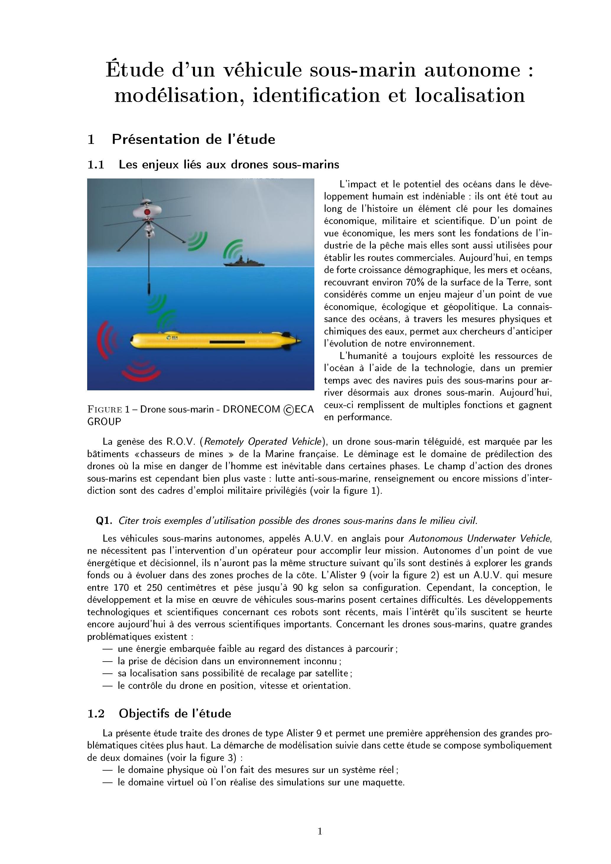 Les véhicules sous-marins autonomes, appelés A.U.V. en anglais pour Autonomous Underwater Vehicle, ne nécessitent pas l'intervention d'un opérateur pour accomplir leur mission. Autonomes d'un point de vue énergétique et décisionnel, ils n'auront pas la même structure suivant qu'ils sont destinés à explorer les grands fonds ou à évoluer dans des zones proches de la côte. L'Alister 9 (voir la figure 2) est un A.U.V. qui mesure entre 170 et 250 centimètres et pèse jusqu'à 90 kg selon sa configuration. Cependant, la conception, le développement et la mise en œuvre de véhicules sous-marins posent certaines difficultés. Les développements technologiques et scientifiques concernant ces robots sont récents, mais l'intérêt qu'ils suscitent se heurte encore aujourd'hui à des verrous scientifiques importants. Concernant les drones sous-marins, quatre grandes problématiques existent :