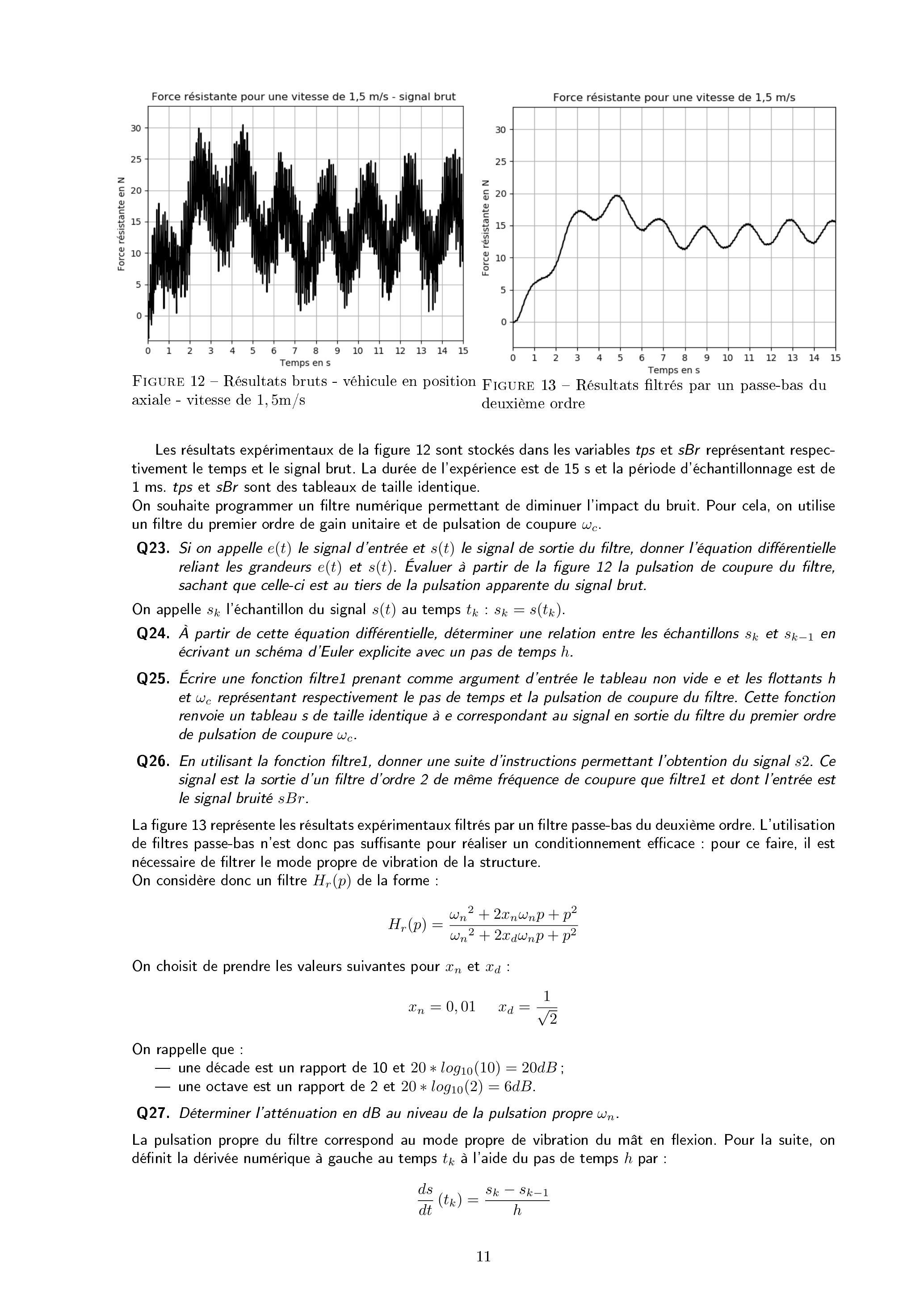 Q25. Écrire une fonction filtre1 prenant comme argument d'entrée le tableau non vide e et les flottants et représentant respectivement le pas de temps et la pulsation de coupure du filtre. Cette fonction renvoie un tableau s de taille identique à e correspondant au signal en sortie du filtre du premier ordre de pulsation de coupure .
