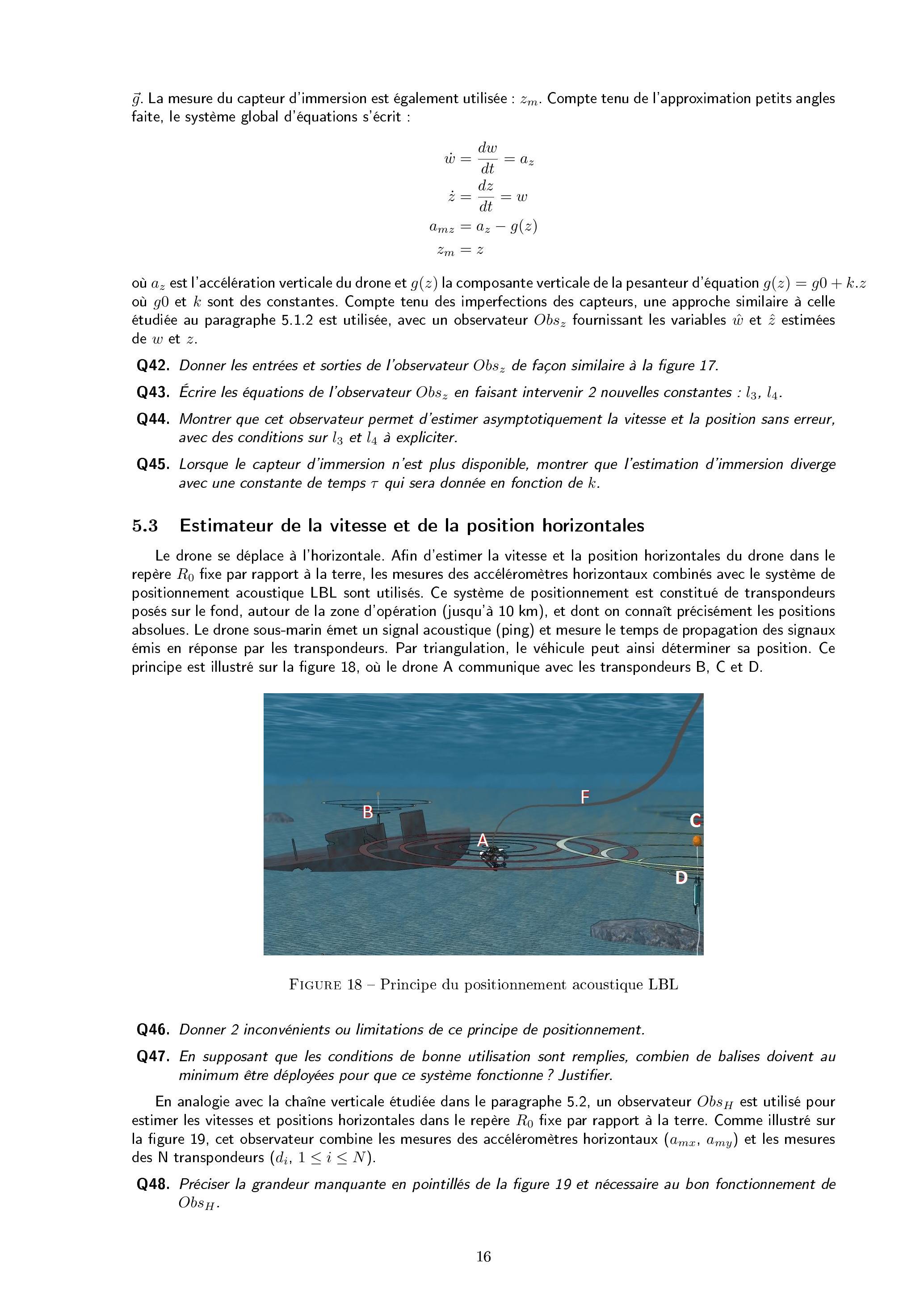 Le drone se déplace à l'horizontale. Afin d'estimer la vitesse et la position horizontales du drone dans le repère fixe par rapport à la terre, les mesures des accéléromètres horizontaux combinés avec le système de positionnement acoustique LBL sont utilisés. Ce système de positionnement est constitué de transpondeurs posés sur le fond, autour de la zone d'opération (jusqu'à 10 km ), et dont on connaît précisément les positions absolues. Le drone sous-marin émet un signal acoustique (ping) et mesure le temps de propagation des signaux émis en réponse par les transpondeurs. Par triangulation, le véhicule peut ainsi déterminer sa position. Ce principe est illustré sur la figure 18, où le drone A communique avec les transpondeurs et D .