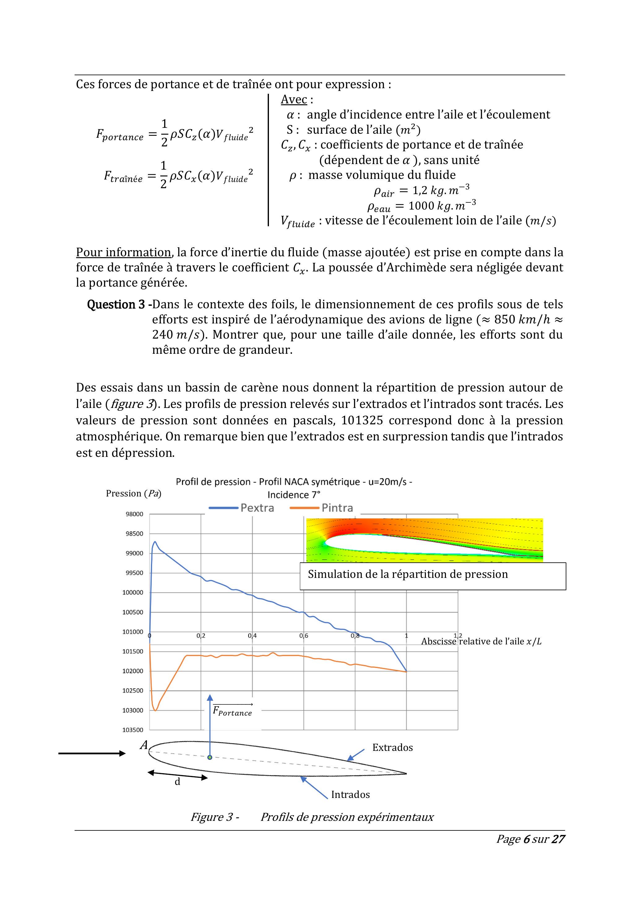 Des essais dans un bassin de carène nous donnent la répartition de pression autour de l'aile (figure 3). Les profils de pression relevés sur l'extrados et l'intrados sont tracés. Les valeurs de pression sont données en pascals, 101325 correspond donc à la pression atmosphérique. On remarque bien que l'extrados est en surpression tandis que l'intrados est en dépression.