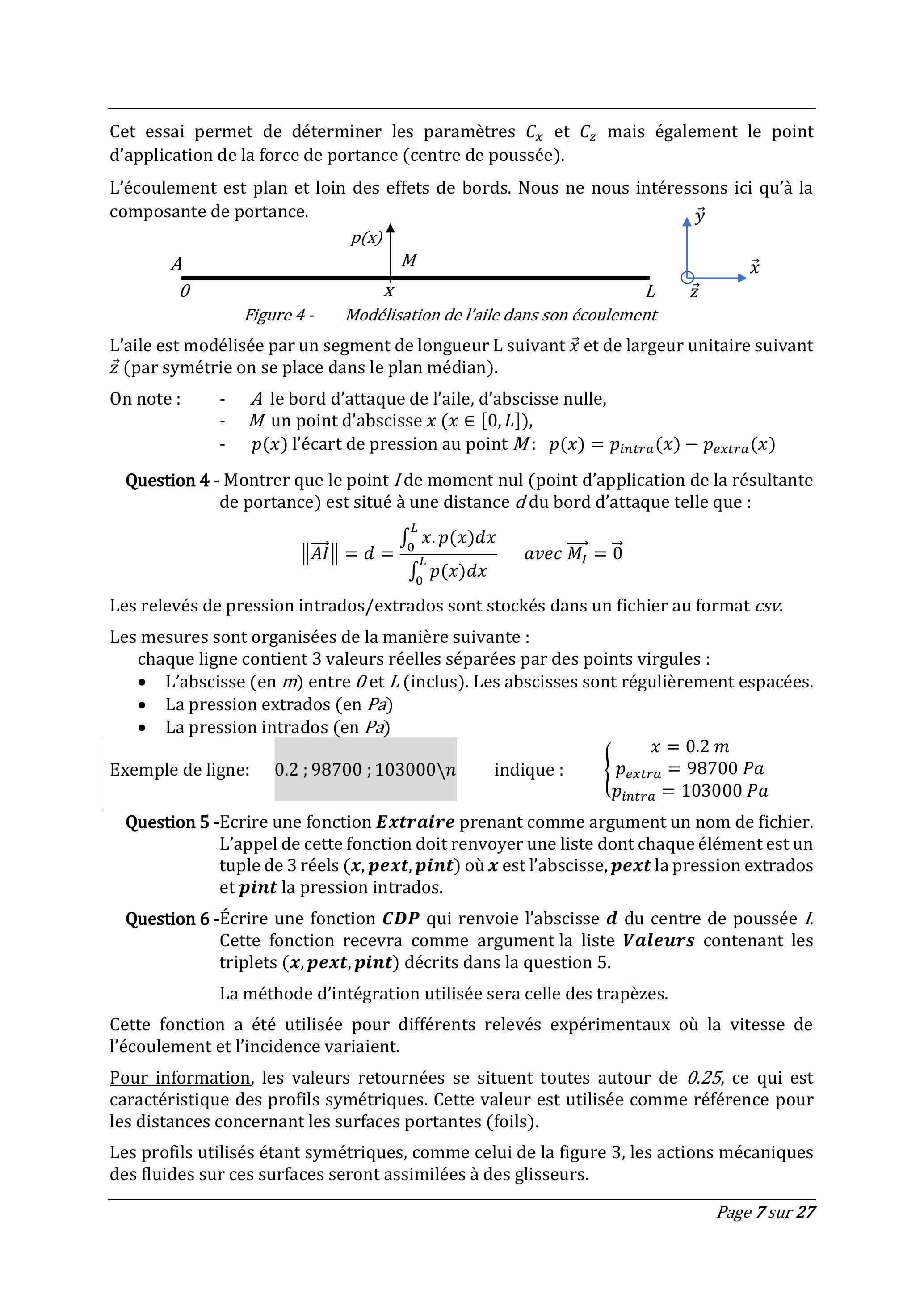 Question 5 -Ecrire une fonction Extraire prenant comme argument un nom de fichier. L'appel de cette fonction doit renvoyer une liste dont chaque élément est un tuple de 3 réels ( , pext, pint) où est l'abscisse, pext la pression extrados et pint la pression intrados.