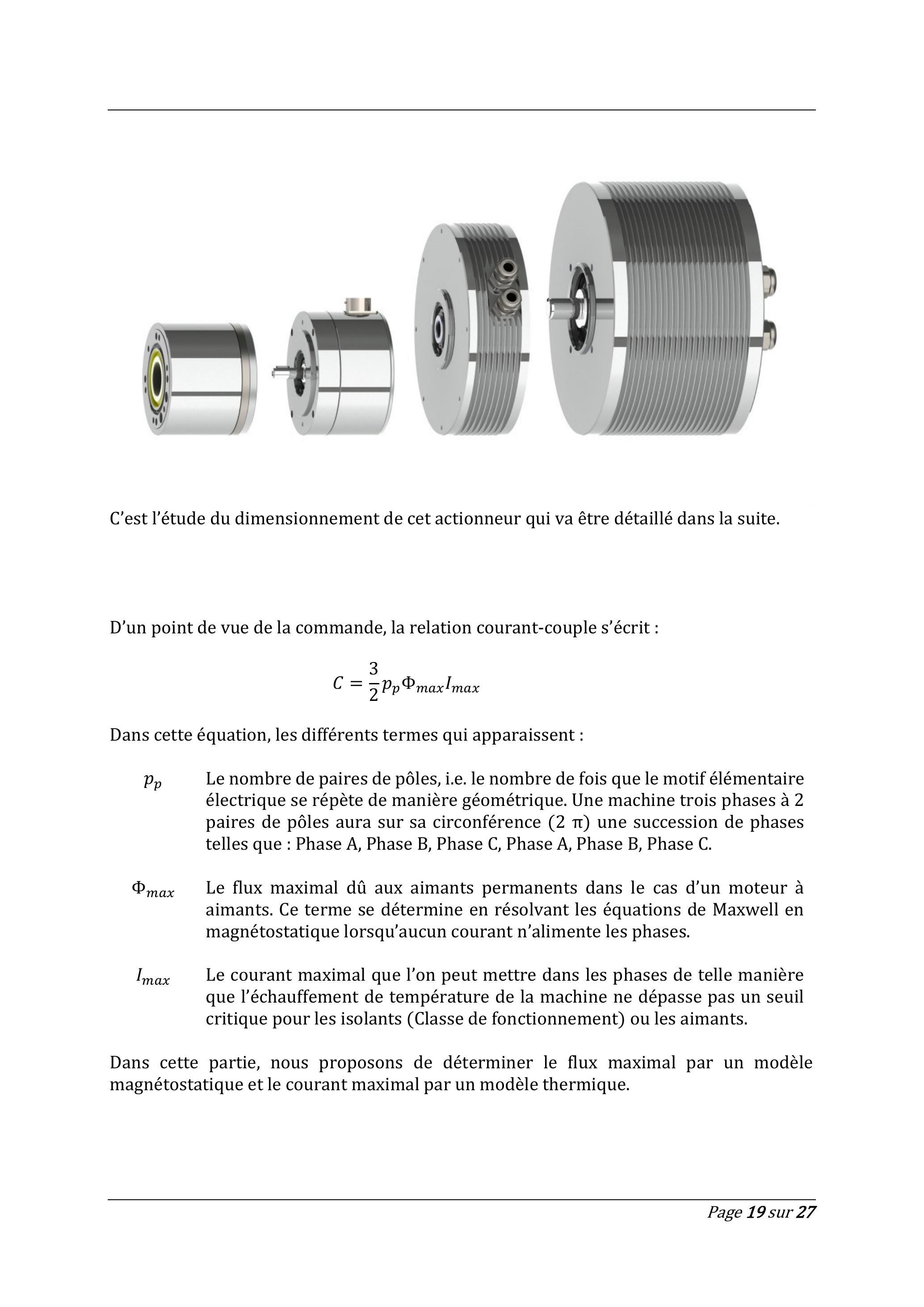 Dans cette équation, les différents termes qui apparaissent : Le nombre de paires de pôles, i.e. le nombre de fois que le motif élémentaire électrique se répète de manière géométrique. Une machine trois phases à 2 paires de pôles aura sur sa circonférence ( ) une succession de phases telles que : Phase A, Phase B, Phase C, Phase A, Phase B, Phase C. Le flux maximal dû aux aimants permanents dans le cas d'un moteur à aimants. Ce terme se détermine en résolvant les équations de Maxwell en magnétostatique lorsqu'aucun courant n'alimente les phases. Le courant maximal que l'on peut mettre dans les phases de telle manière que l'échauffement de température de la machine ne dépasse pas un seuil critique pour les isolants (Classe de fonctionnement) ou les aimants.