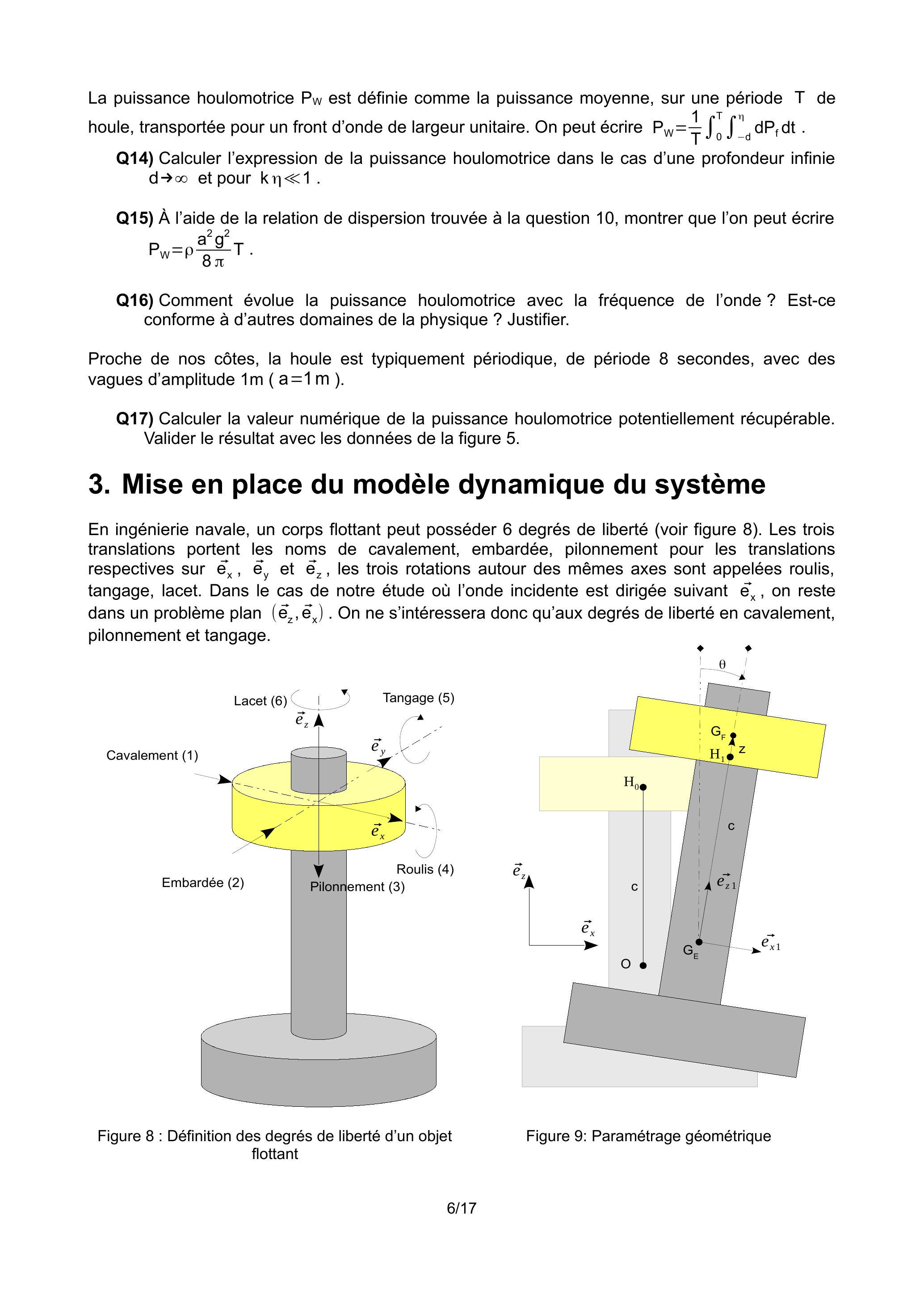 En ingénierie navale, un corps flottant peut posséder 6 degrés de liberté (voir figure 8). Les trois translations portent les noms de cavalement, embardée, pilonnement pour les translations respectives sur et , les trois rotations autour des mêmes axes sont appelées roulis, tangage, lacet. Dans le cas de notre étude où l'onde incidente est dirigée suivant , on reste dans un problème plan . On ne s'intéressera donc qu'aux degrés de liberté en cavalement, pilonnement et tangage.
