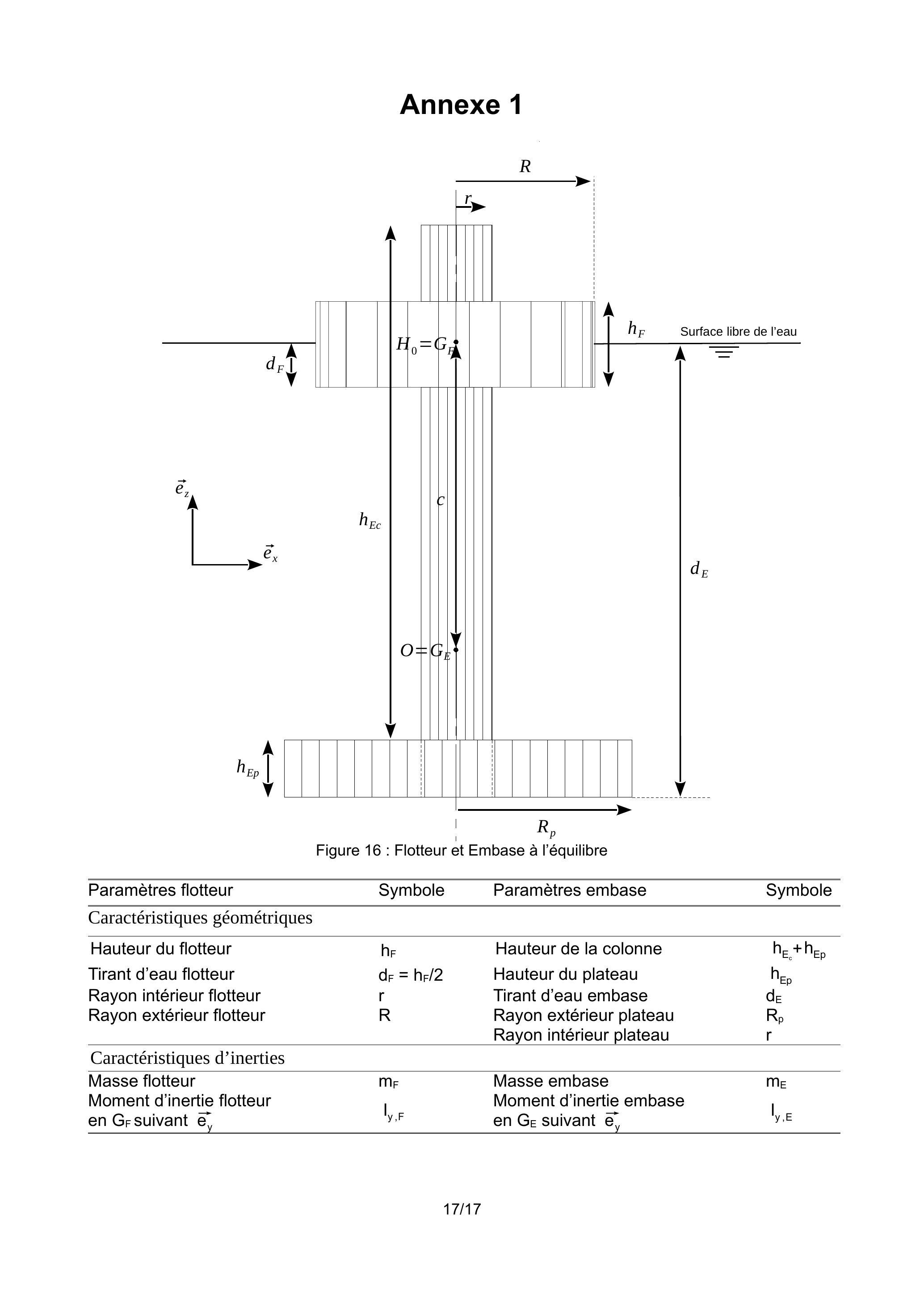 Dans cette notation, les indices et désignent respectivement l'embase et le flotteur. Les paramètres géométriques de l'embase et du flotteur sont consultables à l'annexe 1.