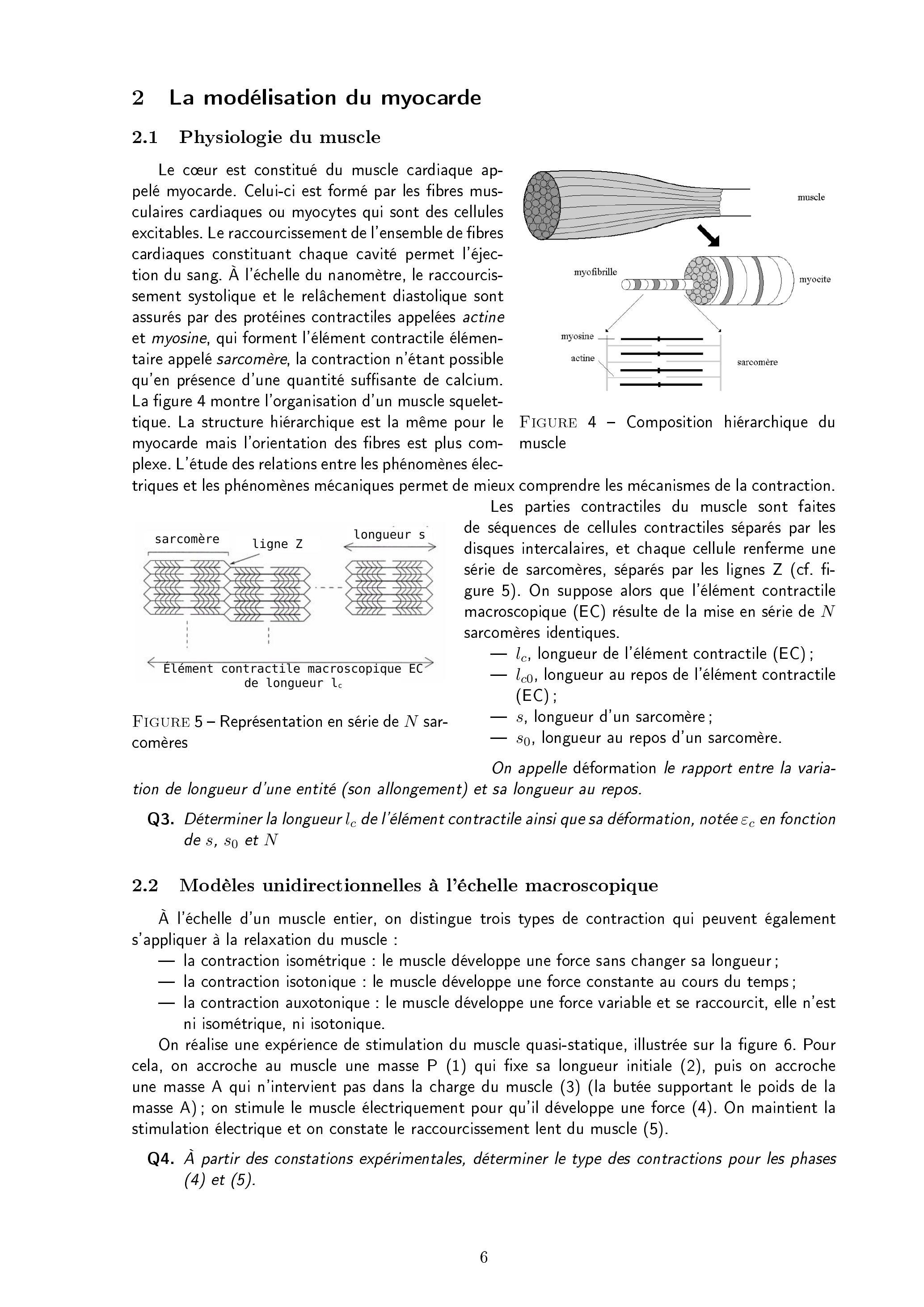 Le cœur est constitué du muscle cardiaque appelé myocarde. Celui-ci est formé par les fibres musculaires cardiaques ou myocytes qui sont des cellules excitables. Le raccourcissement de l'ensemble de fibres cardiaques constituant chaque cavité permet l'éjection du sang. À l'échelle du nanomètre, le raccourcissement systolique et le relâchement diastolique sont assurés par des protéines contractiles appelées actine et myosine, qui forment l'élément contractile élémentaire appelé sarcomère, la contraction n'étant possible qu'en présence d'une quantité suffisante de calcium. La figure 4 montre l'organisation d'un muscle squelettique. La structure hiérarchique est la même pour le myocarde mais l'orientation des fibres est plus com-