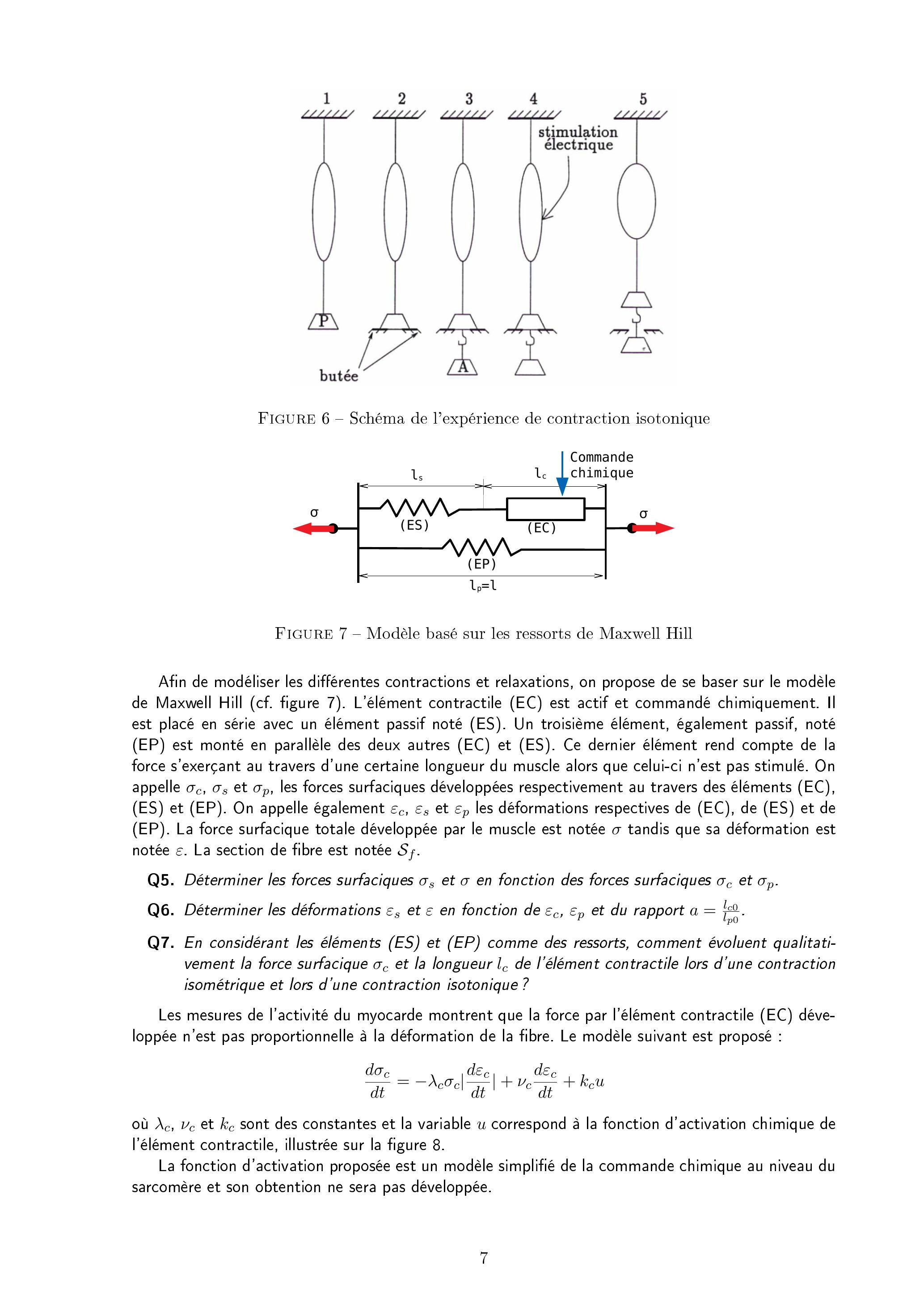 Q7. En considérant les éléments (ES) et (EP) comme des ressorts, comment évoluent qualitativement la force surfacique et la longueur de l'élément contractile lors d'une contraction isométrique et lors d'une contraction isotonique?