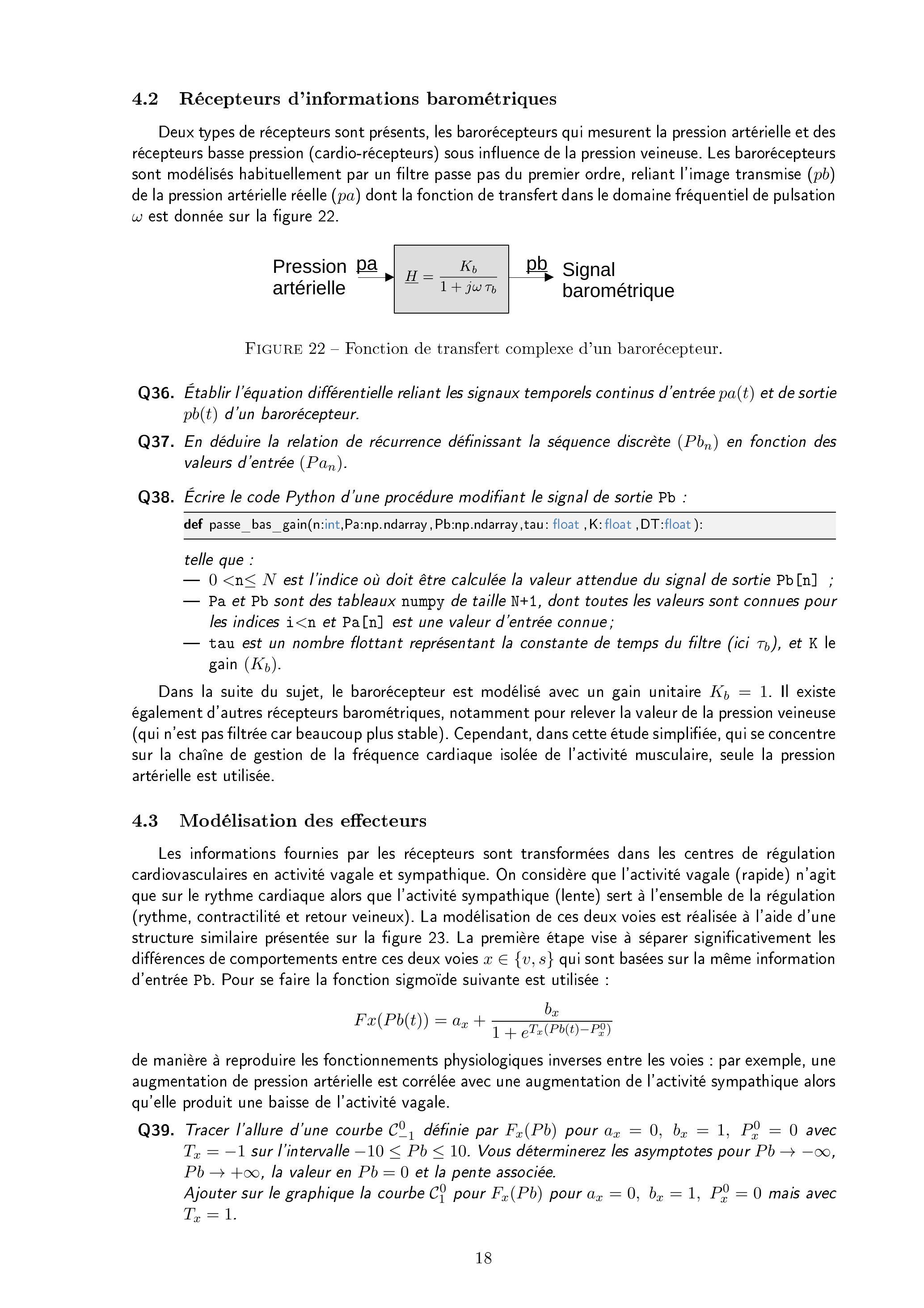 Si la constante de temps du filtre passe-bas de la figure 22 vaut 2 secondes et , en utilisant la fonction de transfert, déterminer l'amplitude des oscillations en régime permanent du signal pb(t) pour une activité cardiaque évoluant dans la plage de pulsation cardiaque considérée.