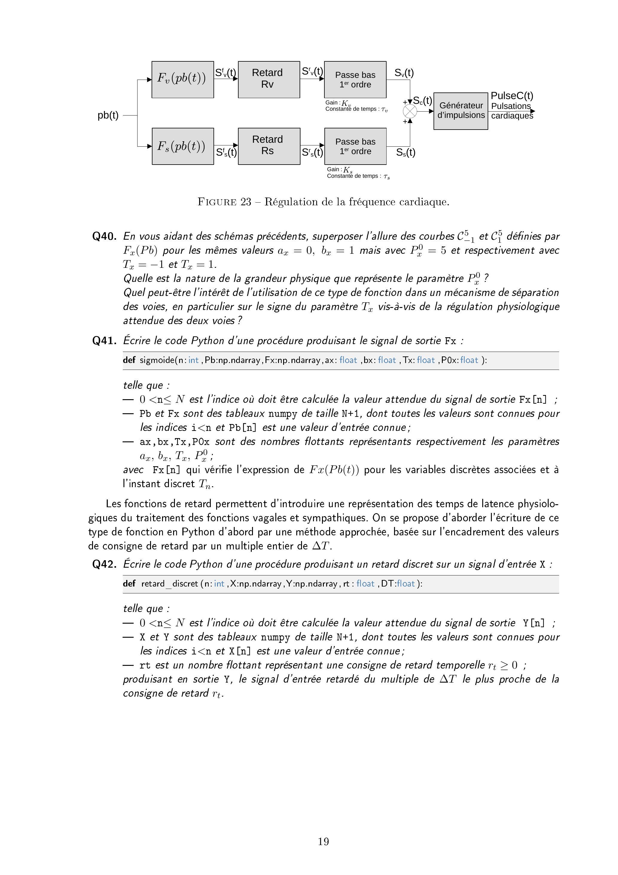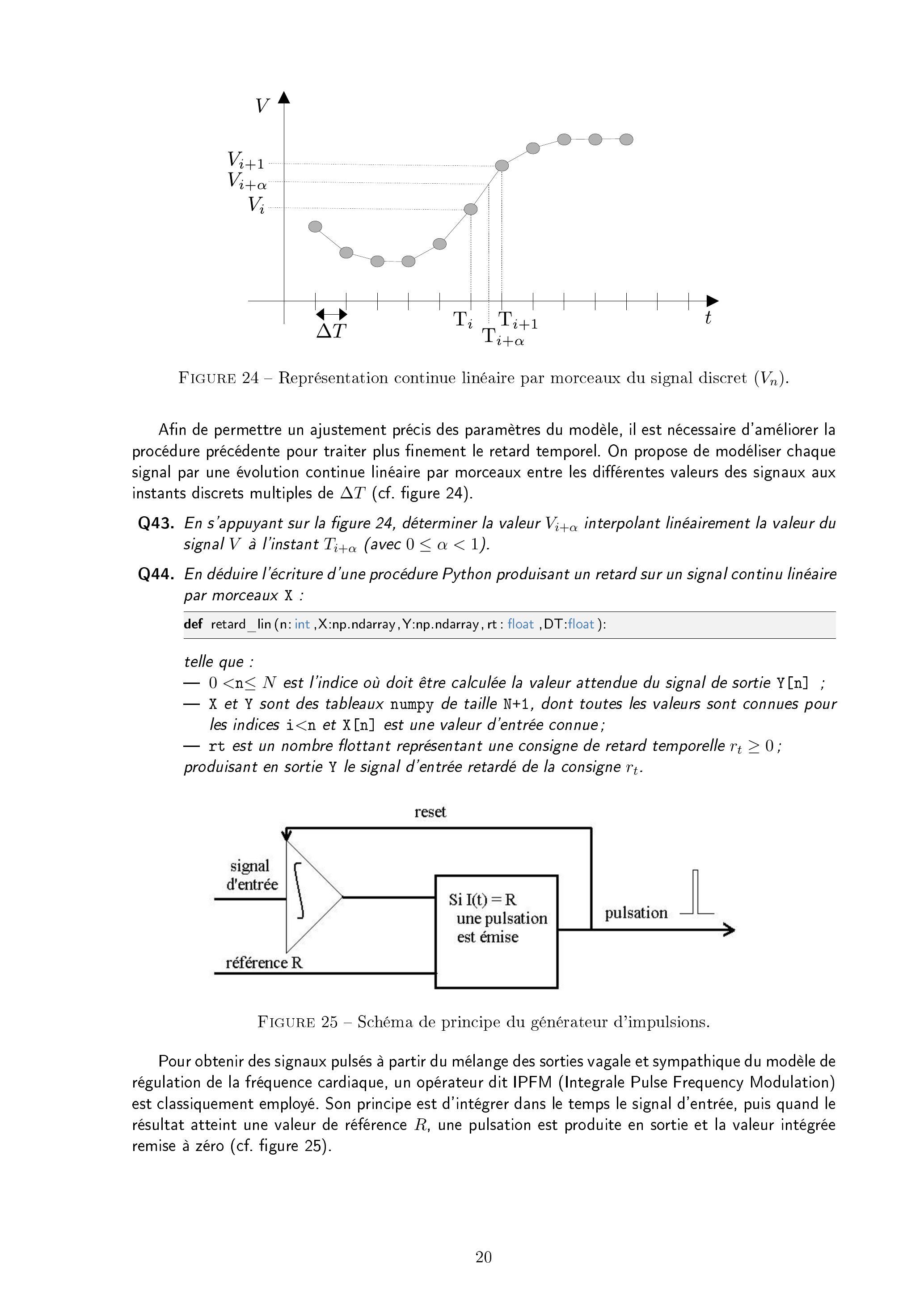 Les fonctions de retard permettent d'introduire une représentation des temps de latence physiologiques du traitement des fonctions vagales et sympathiques. On se propose d'aborder l'écriture de ce type de fonction en Python d'abord par une méthode approchée, basée sur l'encadrement des valeurs de consigne de retard par un multiple entier de .