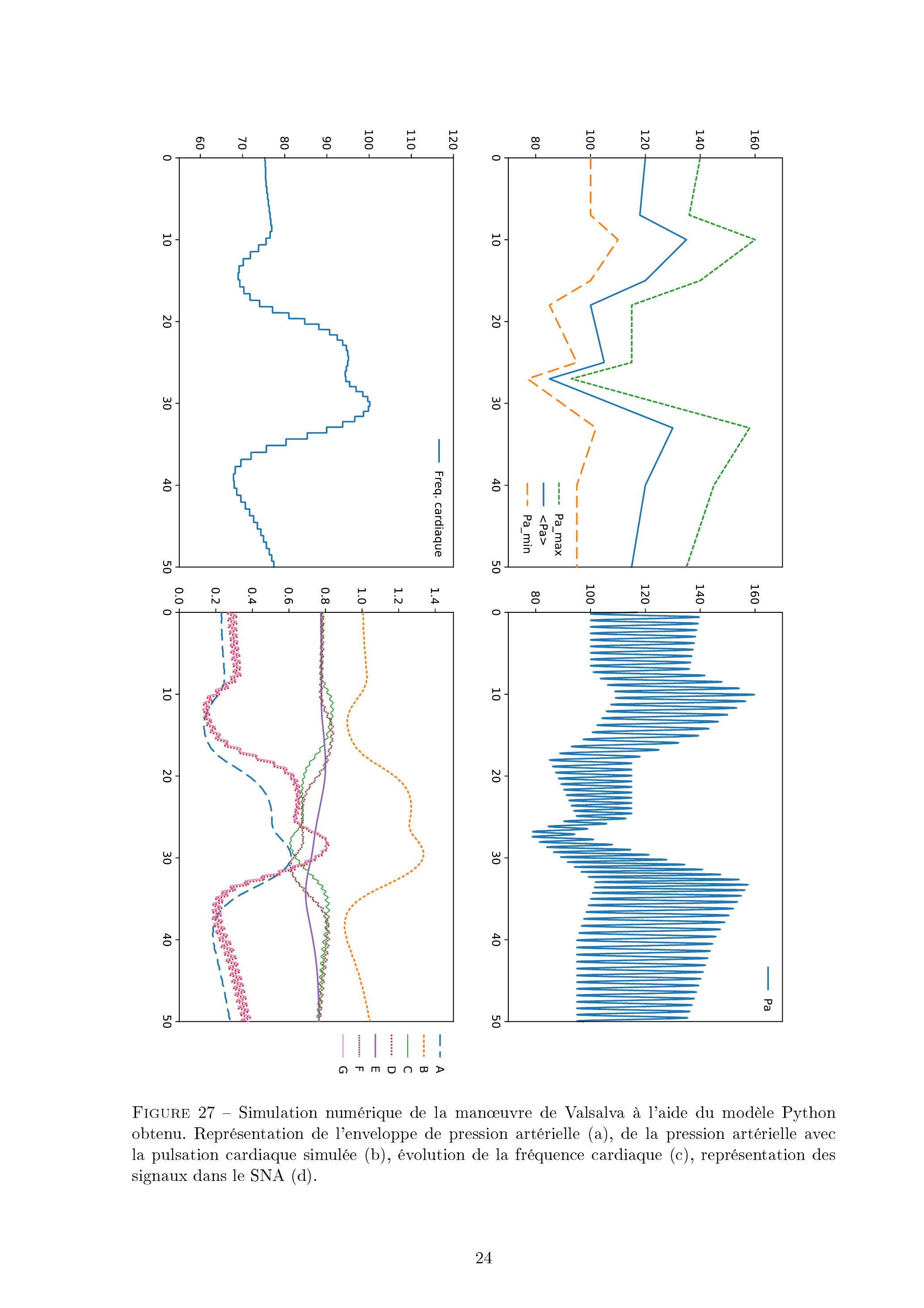 Figure 27 - Simulation numérique de la manœuvre de Valsalva à l'aide du modèle Python obtenu. Représentation de l'enveloppe de pression artérielle (a), de la pression artérielle avec la pulsation cardiaque simulée (b), évolution de la fréquence cardiaque (c), représentation des signaux dans le SNA (d).