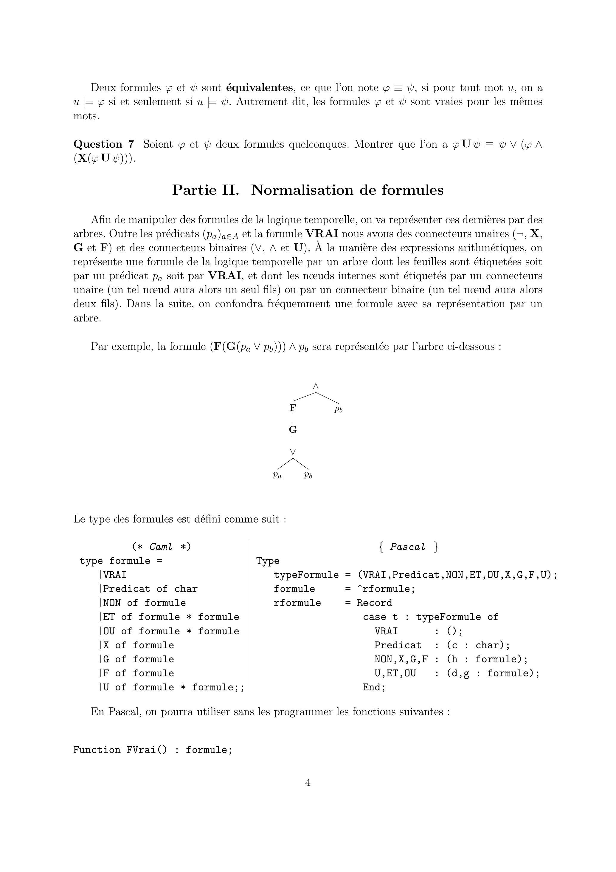 Question 9 Donner, pour toute formule n'utilisant pas le connecteur , une formule équivalente à qui n'utilise pas le connecteur temporel . En déduire une fonction normaliseF qui prend en entrée une formule quelconque et renvoie une formule équivalente qui n'utilise pas le connecteur F. Quelle est la complexité de votre algorithme?