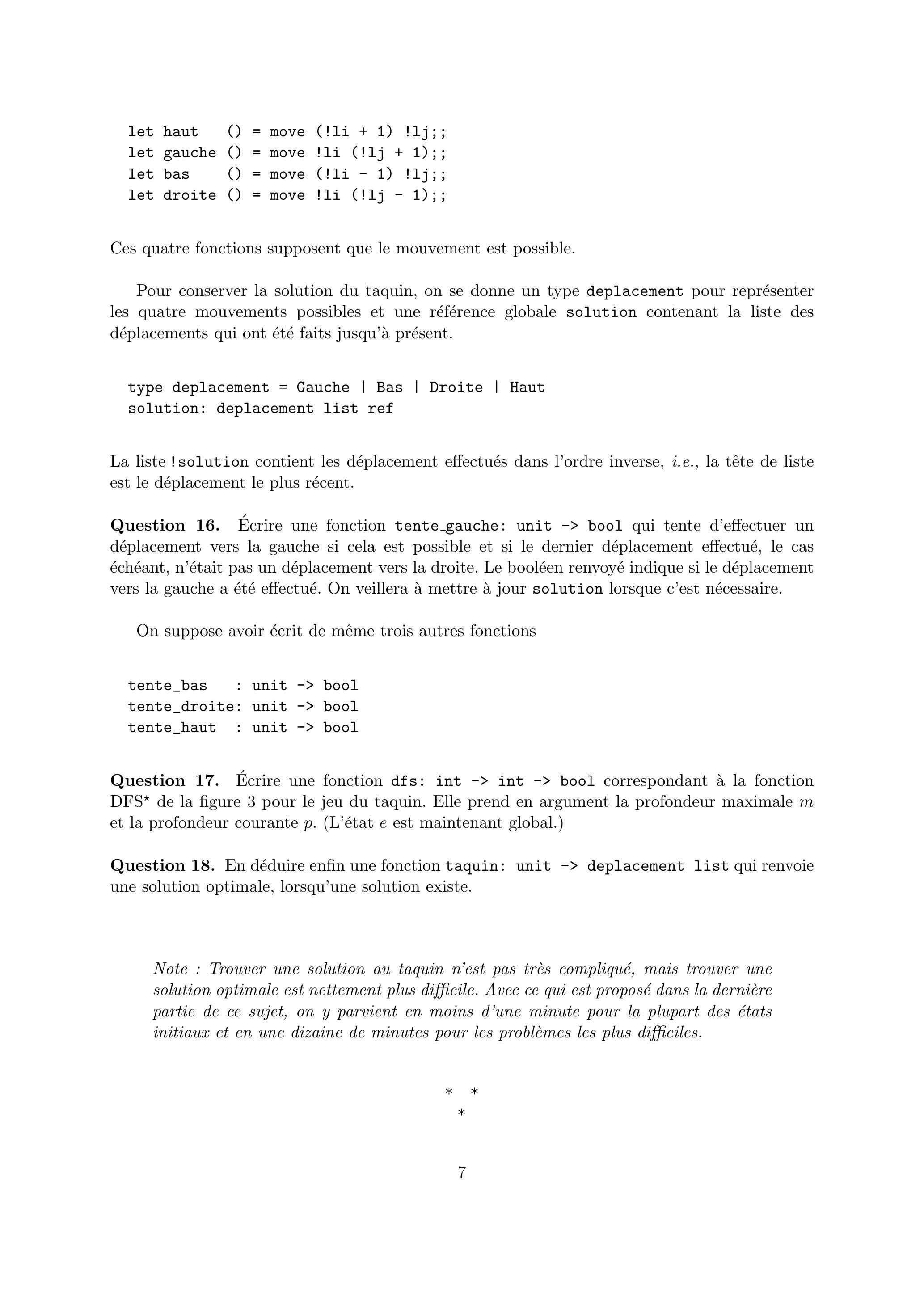 Question 18. En déduire enfin une fonction taquin: unit deplacement list qui renvoie une solution optimale, lorsqu'une solution existe.