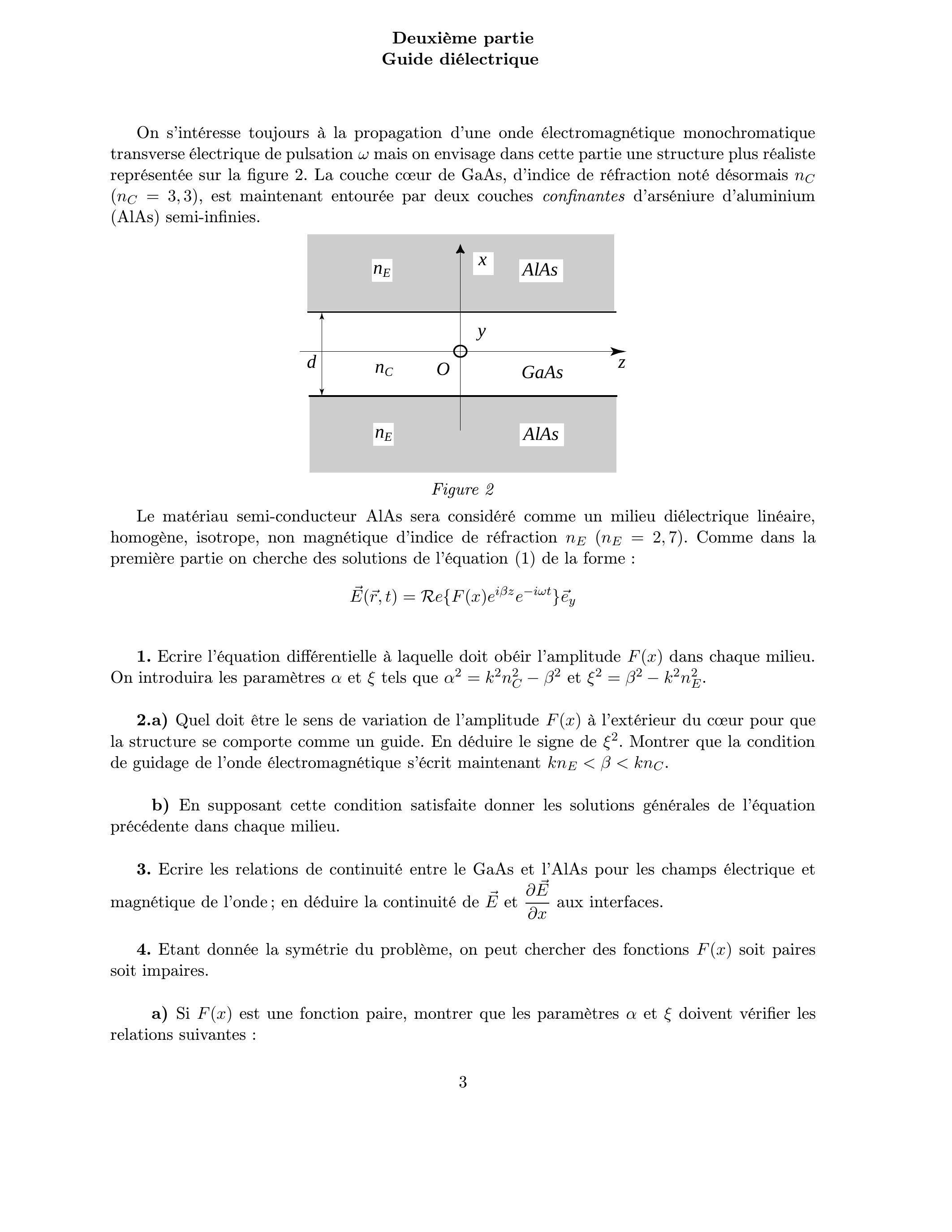 3. On se limite au cas de la propagation des ondes transverses électriques pour lesquelles le champ est orienté selon et on cherche une solution de l'équation (1) sous la forme