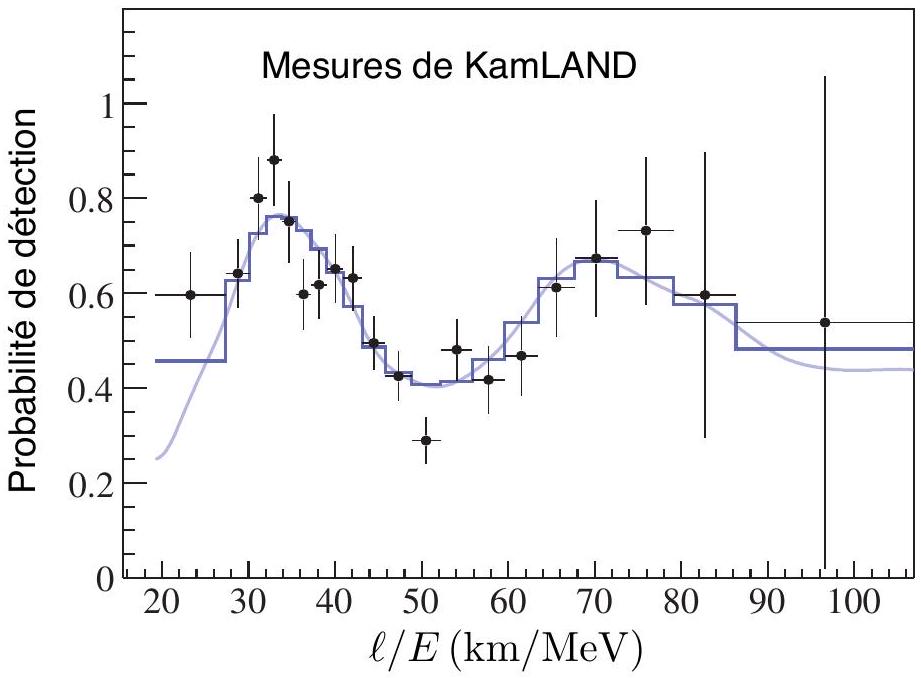 - En 2002, la collaboration KamLAND, utilisant le détecteur Super-Kamiokande, a recueilli les neutrinos électroniques issus de tous les réacteurs nucléaires du Japon, ce qui revient à prendre une distance moyenne