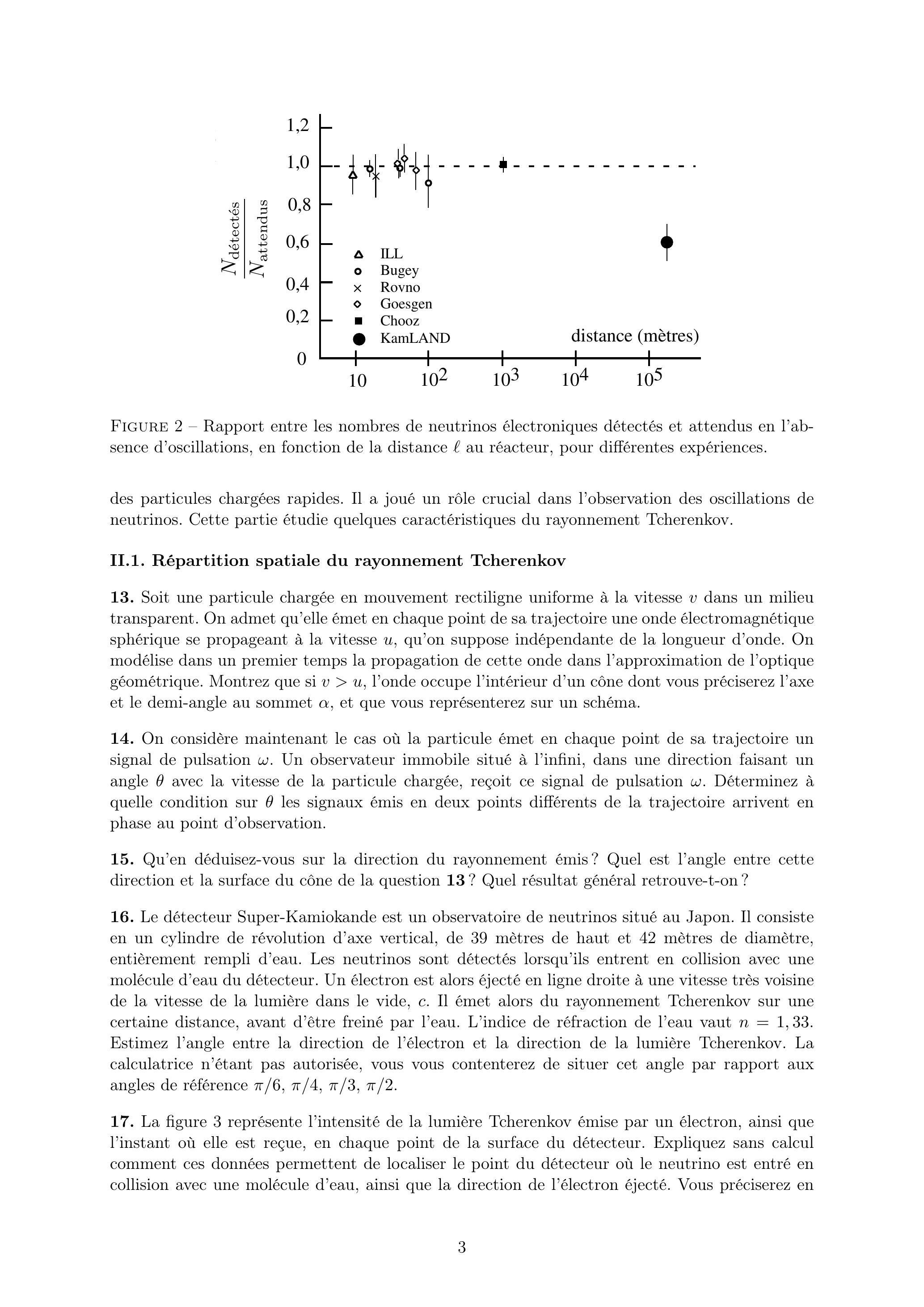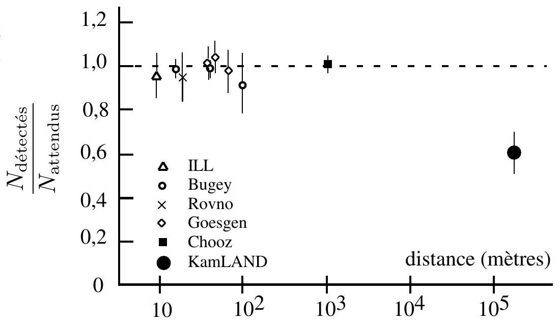 11. D'autres expériences de détection de neutrinos issus de centrales nucléaires ont été réalisées, notamment auprès du réacteur franco-belge de Chooz dans les Ardennes et du réacteur du Bugey dans l'Ain. Leurs résultats sont indiqués sur la figure 2. Expliquez ces résultats en considérant des neutrinos d'énergie