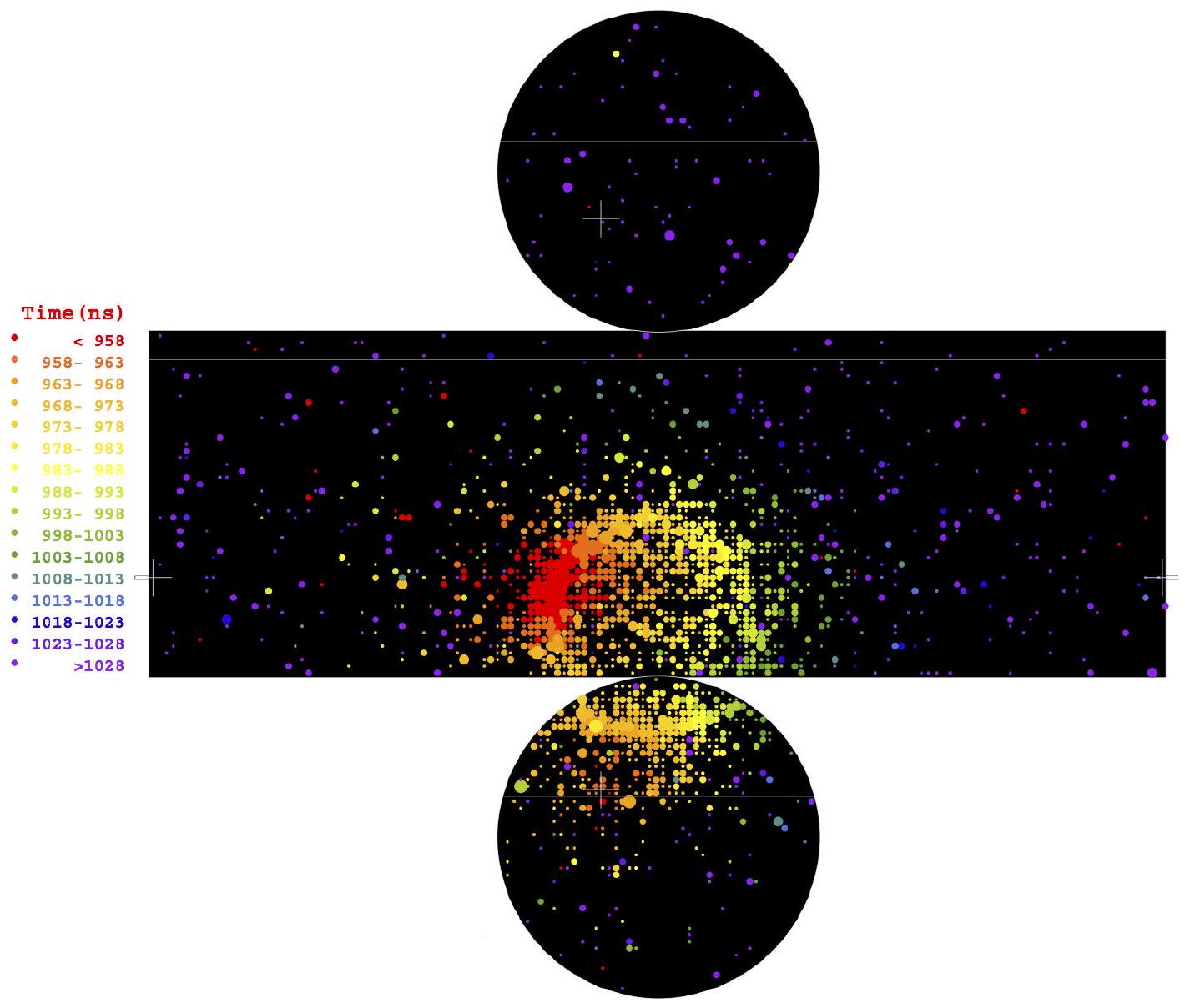 Figure 3 - Rayonnement Tcherenkov produit par un électron, et détecté par Super-Kamiokande. Les photomultiplicateurs sont répartis sur toute la surface du cylindre. Les deux disques correspondent au couvercle et au fond du cylindre, et le rectangle allongé à sa surface latérale qui a été dépliée pour permettre une représentation plane. Les points colorés sont ceux où la lumière est observée, et on a choisi des couleurs différentes suivant les temps d'arrivée de la lumière, comptés à partir d'une origine arbitraire.
