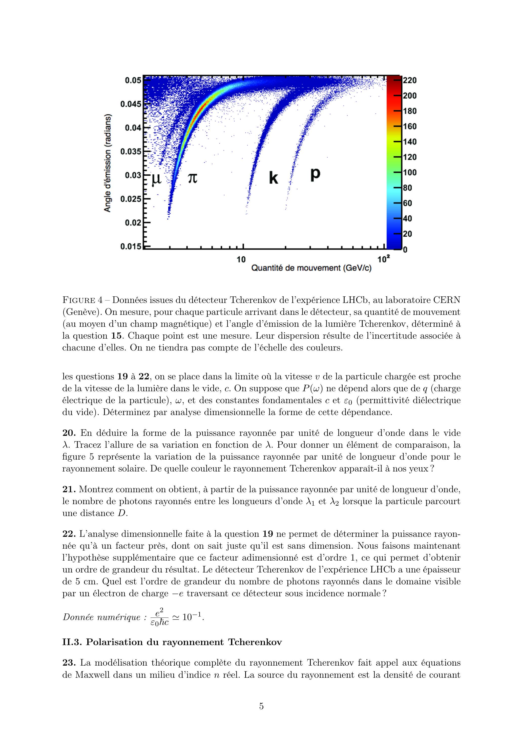 22. L'analyse dimensionnelle faite à la question 19 ne permet de déterminer la puissance rayonnée qu'à un facteur près, dont on sait juste qu'il est sans dimension. Nous faisons maintenant l'hypothèse supplémentaire que ce facteur adimensionné est d'ordre 1, ce qui permet d'obtenir un ordre de grandeur du résultat. Le détecteur Tcherenkov de l'expérience LHCb a une épaisseur de 5 cm . Quel est l'ordre de grandeur du nombre de photons rayonnés dans le domaine visible par un électron de charge