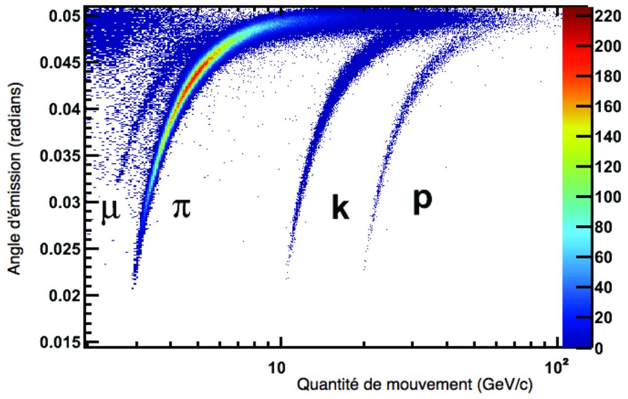 Figure 4 - Données issues du détecteur Tcherenkov de l'expérience LHCb, au laboratoire CERN (Genève). On mesure, pour chaque particule arrivant dans le détecteur, sa quantité de mouvement (au moyen d'un champ magnétique) et l'angle d'émission de la lumière Tcherenkov, déterminé à la question 15. Chaque point est une mesure. Leur dispersion résulte de l'incertitude associée à chacune d'elles. On ne tiendra pas compte de l'échelle des couleurs.