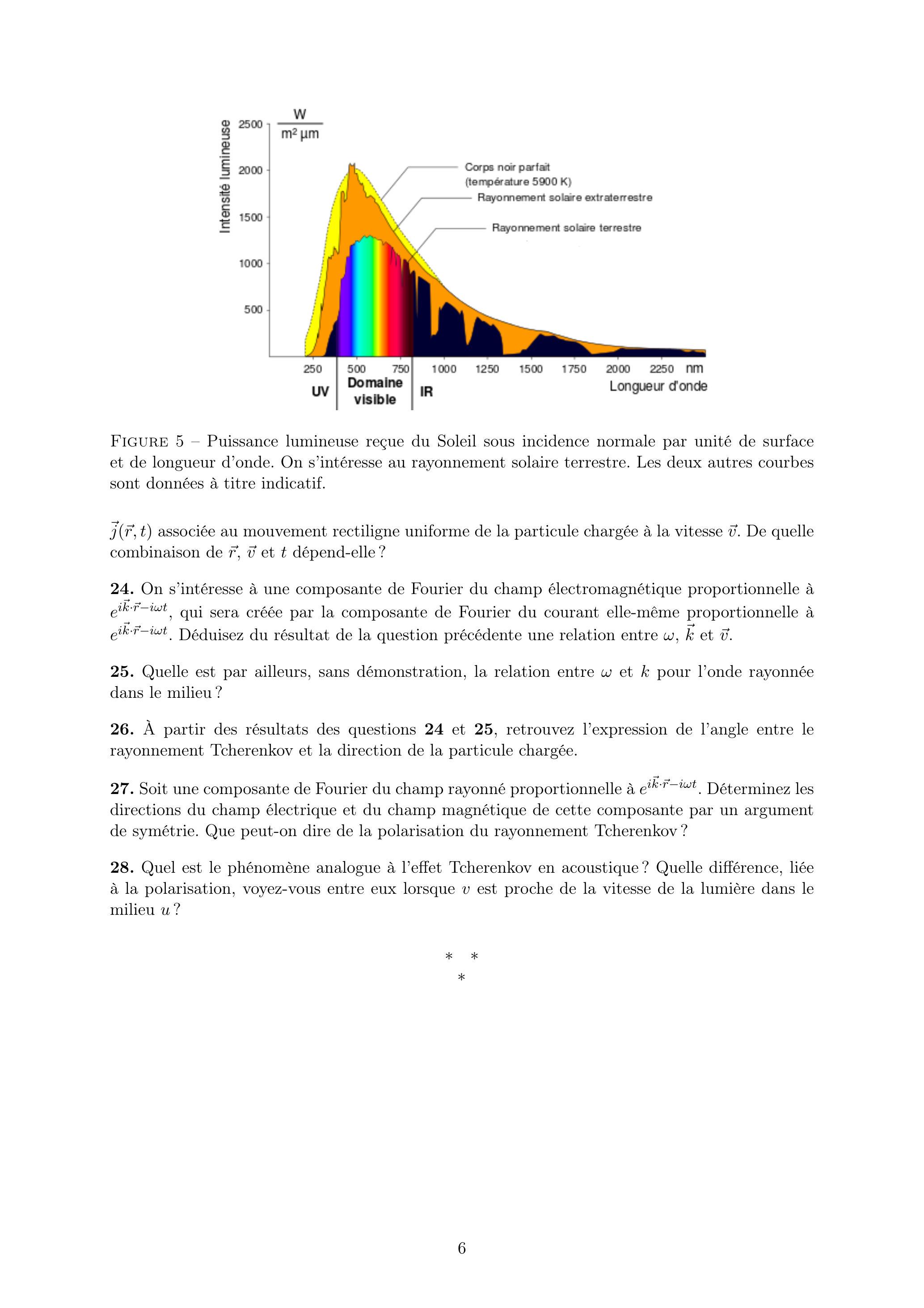 . Pour donner un élément de comparaison, la figure 5 représente la variation de la puissance rayonnée par unité de longueur d'onde pour le rayonnement solaire. De quelle couleur le rayonnement Tcherenkov apparaît-il à nos yeux?