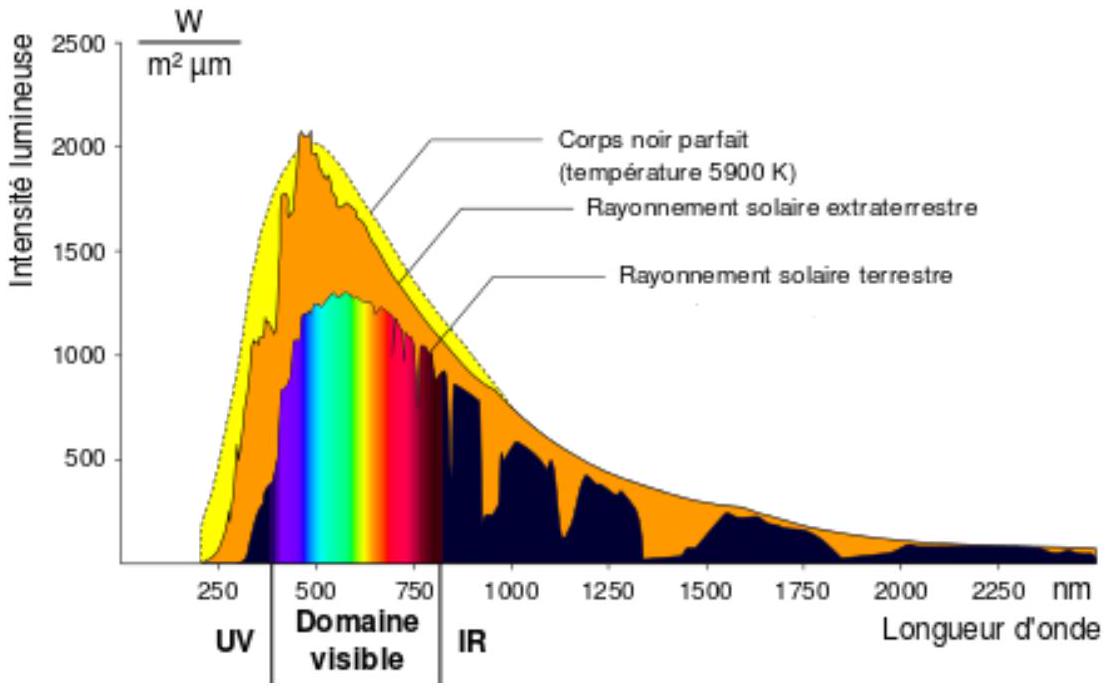 Figure 5 - Puissance lumineuse reçue du Soleil sous incidence normale par unité de surface et de longueur d'onde. On s'intéresse au rayonnement solaire terrestre. Les deux autres courbes sont données à titre indicatif.