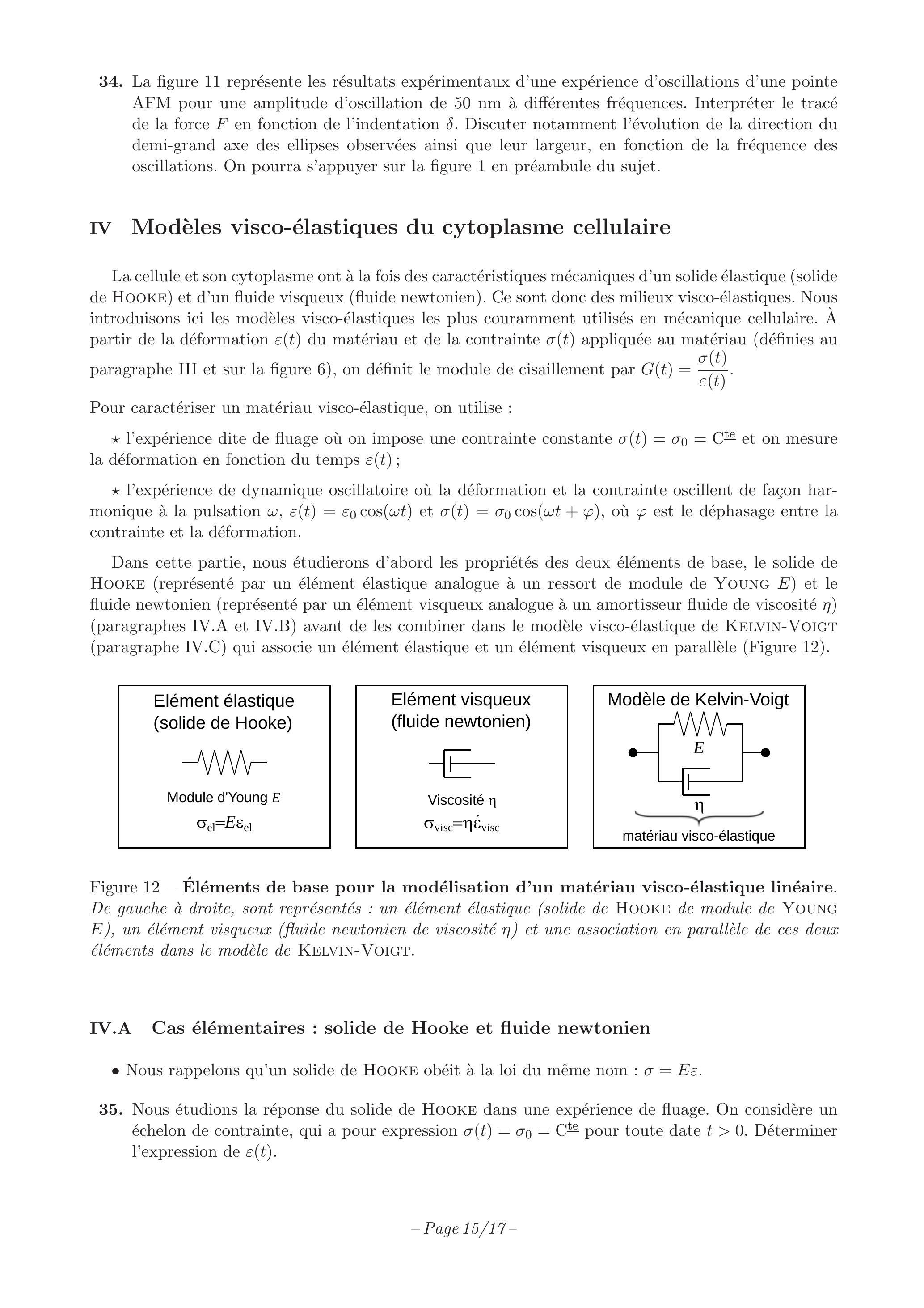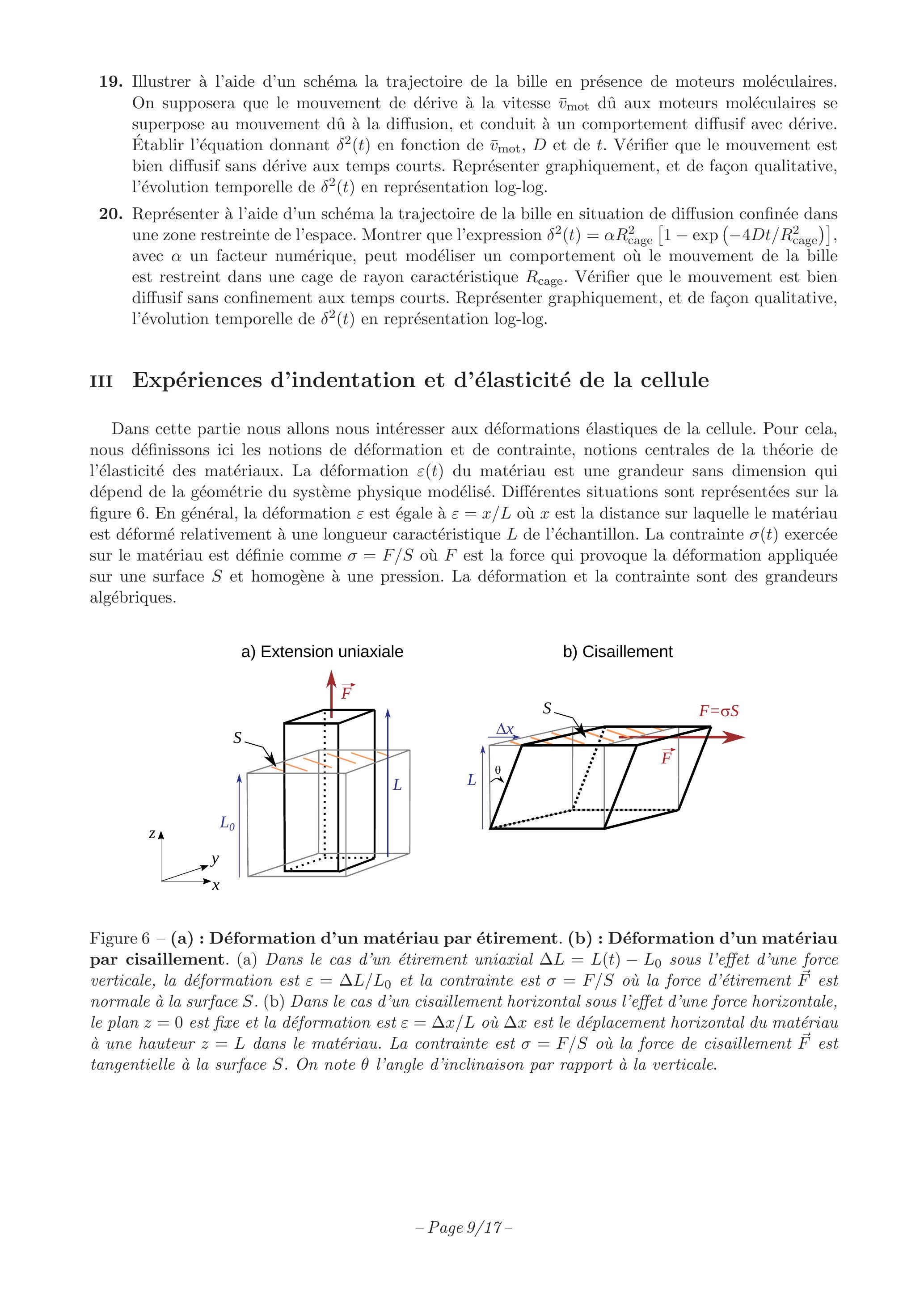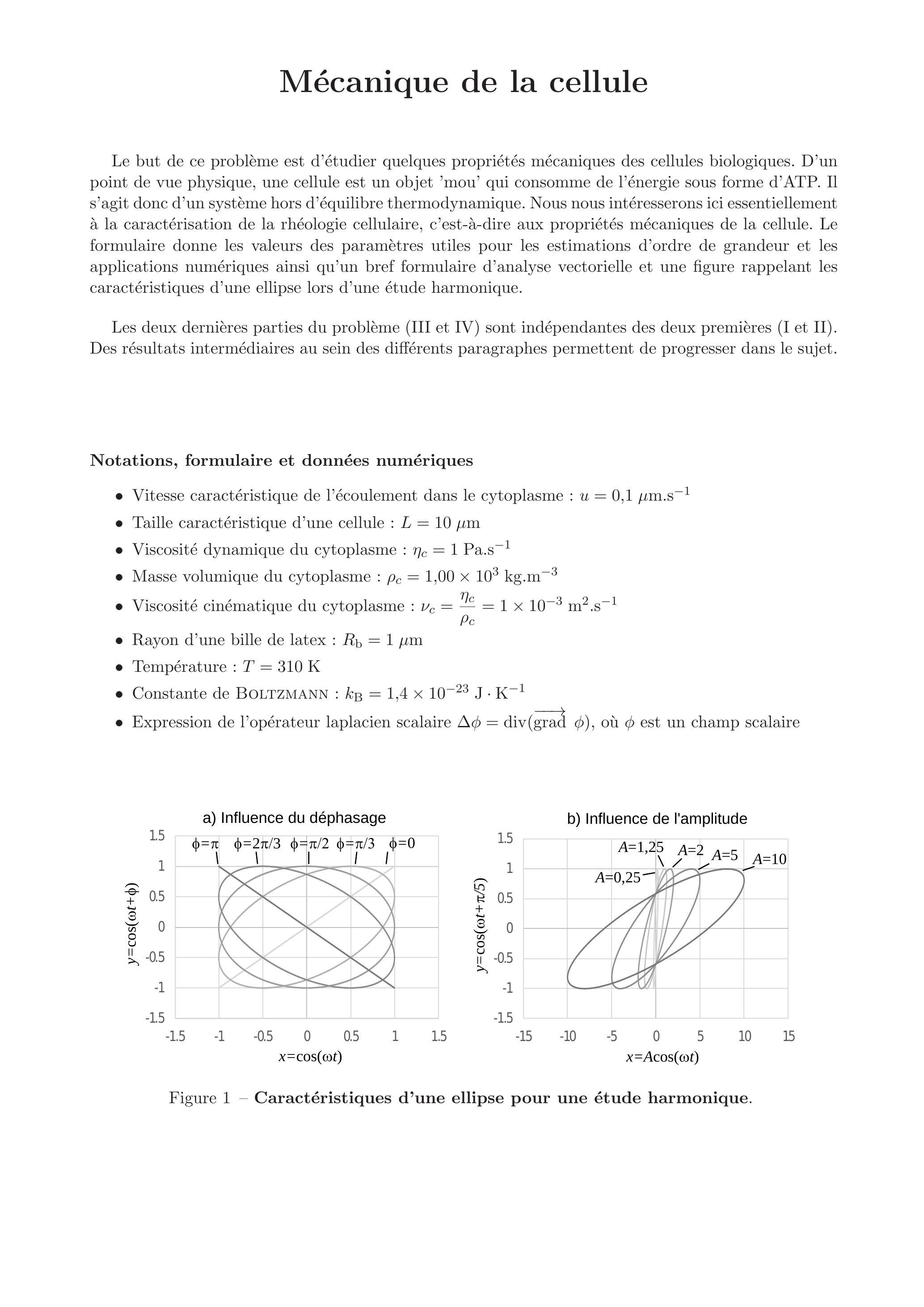 Le but de ce problème est d'étudier quelques propriétés mécaniques des cellules biologiques. D'un point de vue physique, une cellule est un objet 'mou' qui consomme de l'énergie sous forme d'ATP. Il s'agit donc d'un système hors d'équilibre thermodynamique. Nous nous intéresserons ici essentiellement à la caractérisation de la rhéologie cellulaire, c'est-à-dire aux propriétés mécaniques de la cellule. Le formulaire donne les valeurs des paramètres utiles pour les estimations d'ordre de grandeur et les applications numériques ainsi qu'un bref formulaire d'analyse vectorielle et une figure rappelant les caractéristiques d'une ellipse lors d'une étude harmonique.