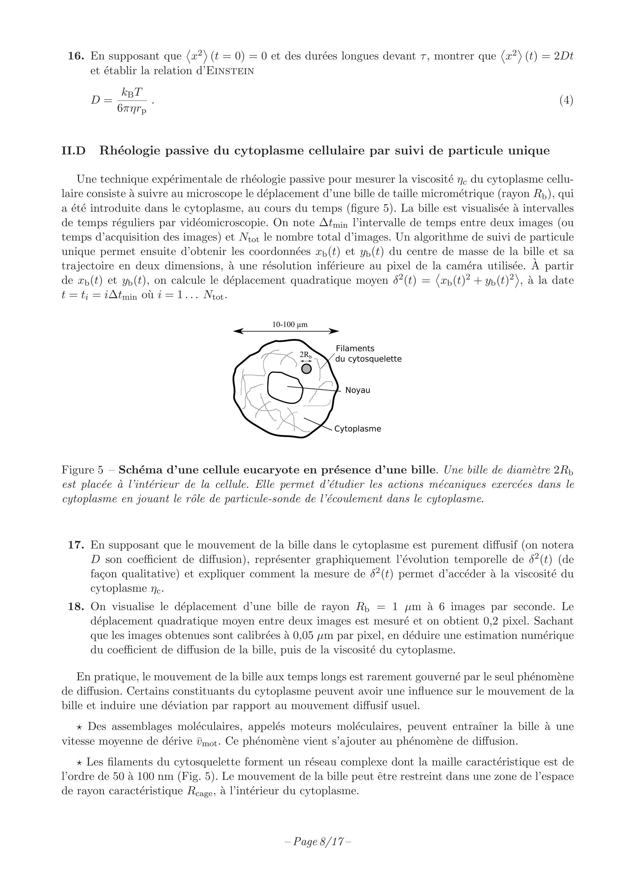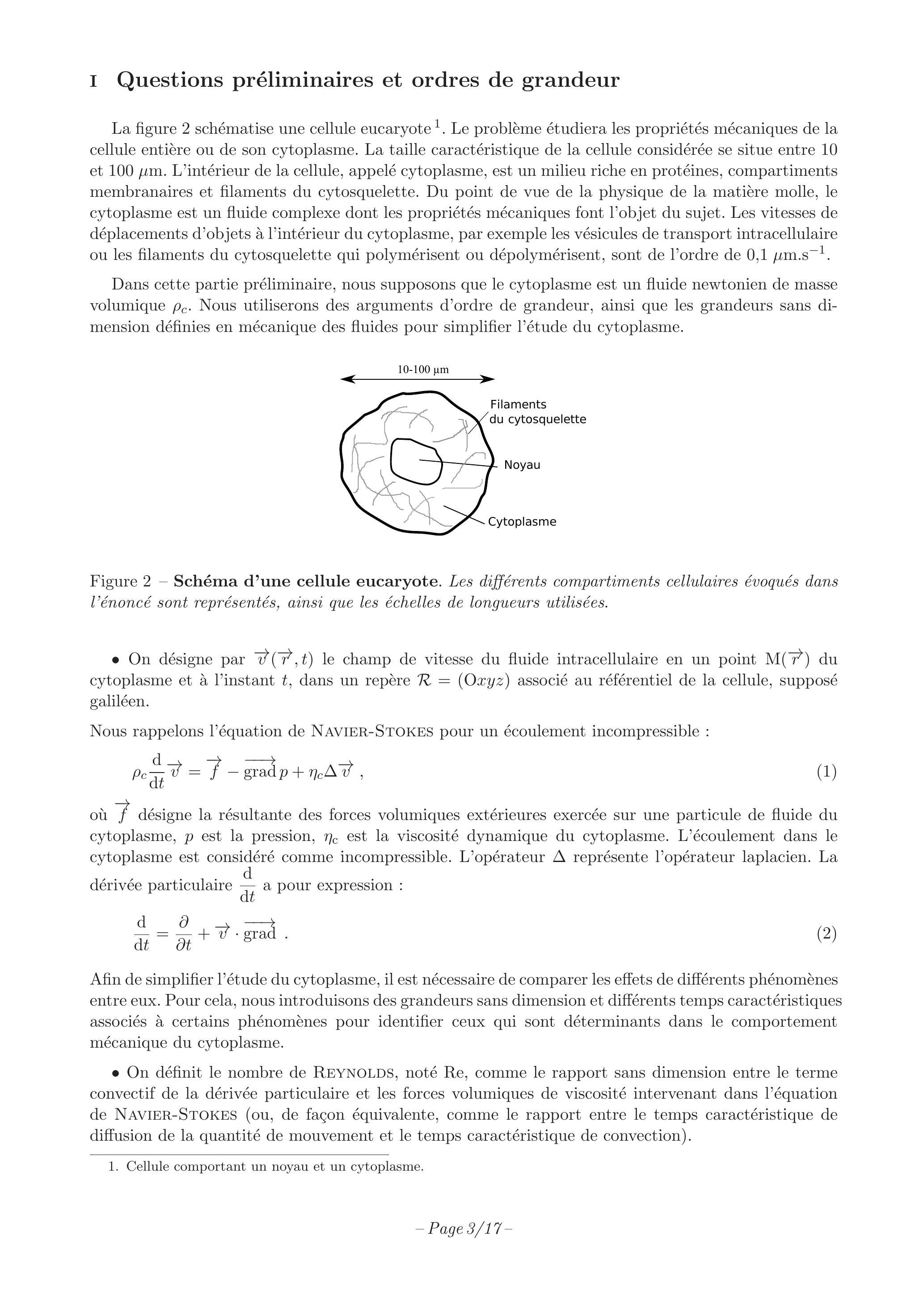 La figure 2 schématise une cellule eucaryote . Le problème étudiera les propriétés mécaniques de la cellule entière ou de son cytoplasme. La taille caractéristique de la cellule considérée se situe entre 10 et . L'intérieur de la cellule, appelé cytoplasme, est un milieu riche en protéines, compartiments membranaires et filaments du cytosquelette. Du point de vue de la physique de la matière molle, le cytoplasme est un fluide complexe dont les propriétés mécaniques font l'objet du sujet. Les vitesses de déplacements d'objets à l'intérieur du cytoplasme, par exemple les vésicules de transport intracellulaire ou les filaments du cytosquelette qui polymérisent ou dépolymérisent, sont de l'ordre de .