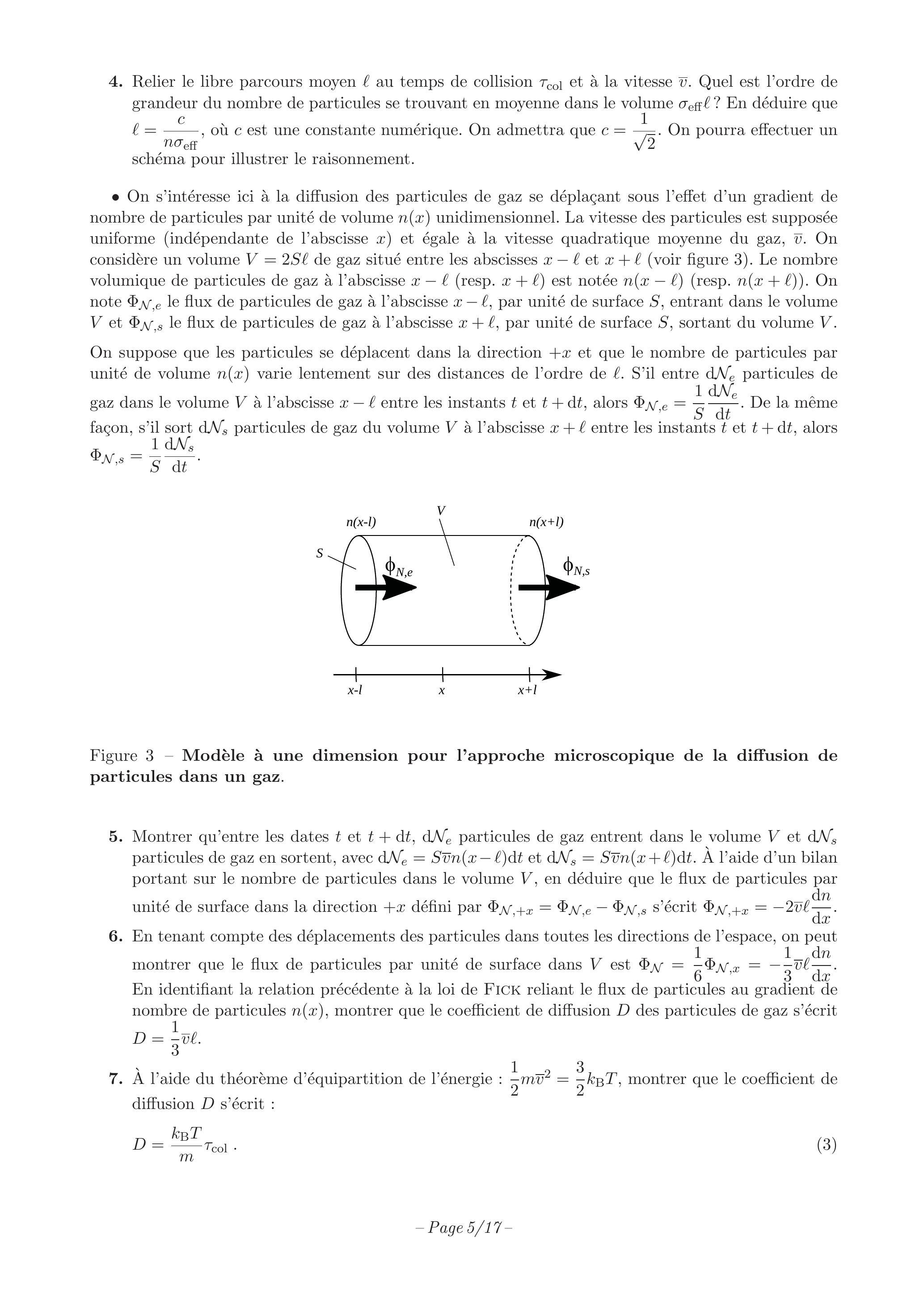 12. Le coefficient de diffusion de particules à trois dimensions étant défini par , préciser l'expression de en fonction du libre parcours moyen et du temps de collision . Comparer cette expression à celle de , obtenue par l'approche microscopique de la diffusion de particules à la question 6 .