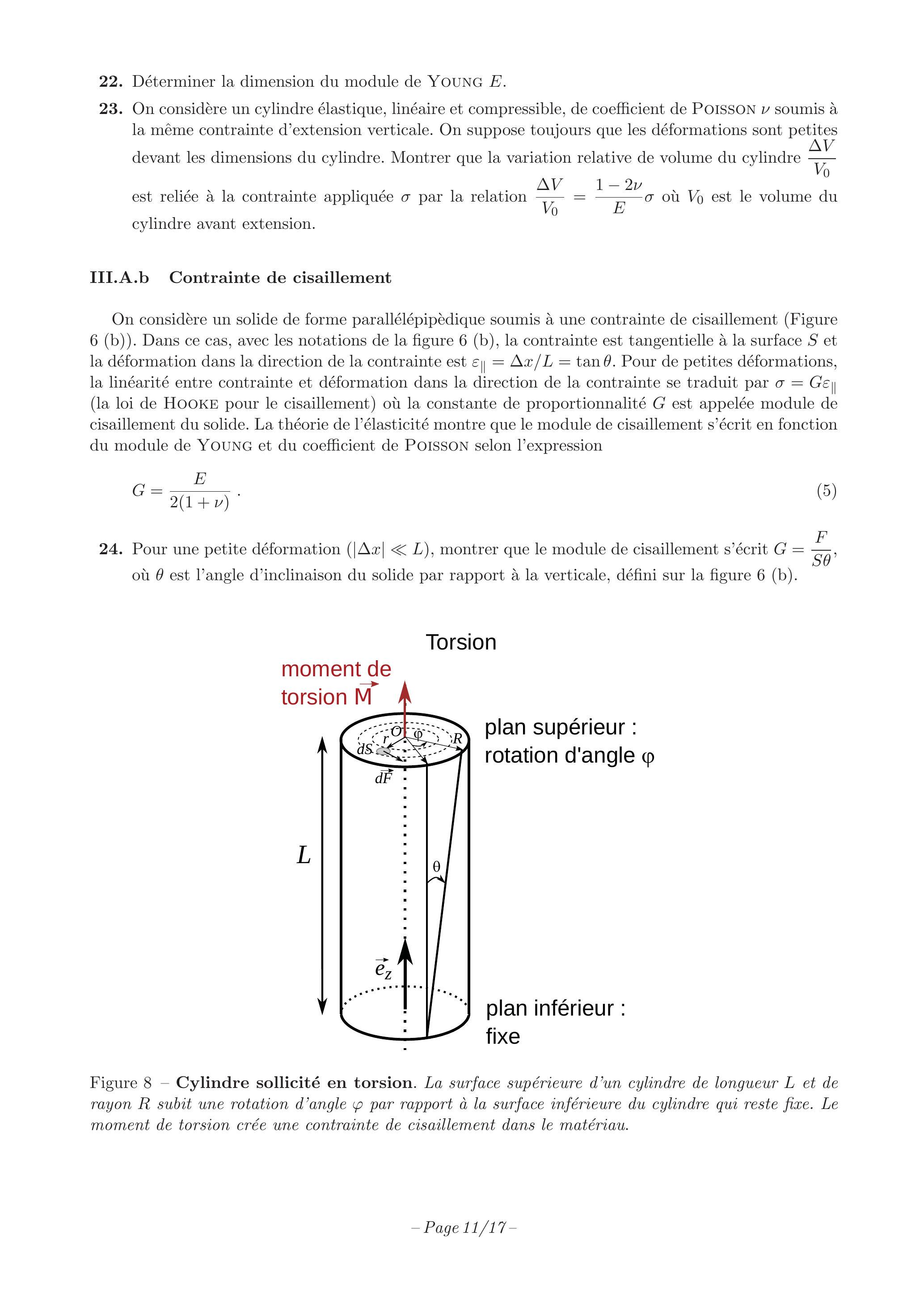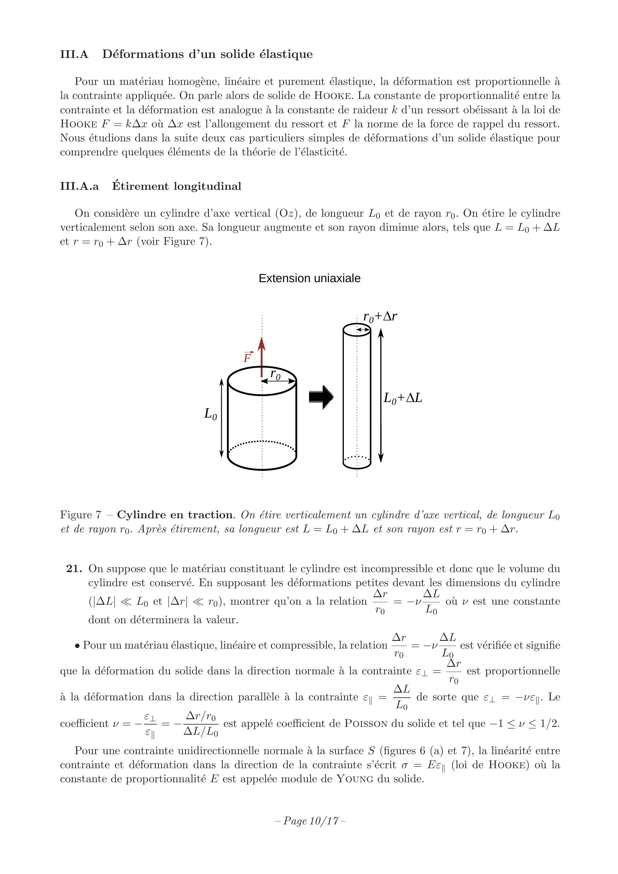 21. On suppose que le matériau constituant le cylindre est incompressible et donc que le volume du cylindre est conservé. En supposant les déformations petites devant les dimensions du cylindre et , montrer qu'on a la relation où est une constante dont on déterminera la valeur.