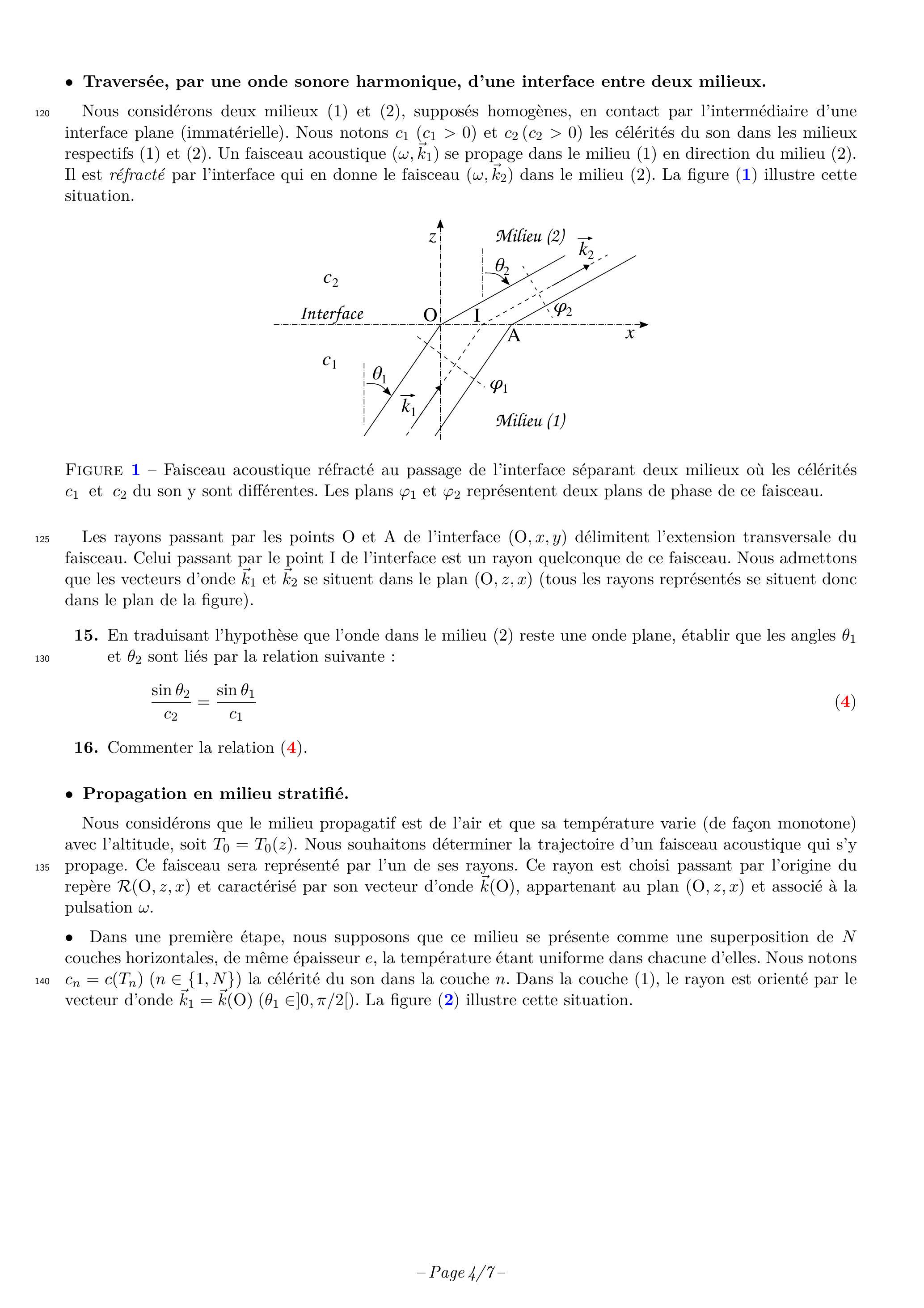Cette étude comprend deux parties. La première est consacrée à l'analyse des hypothèses sur lesquelles repose l'acoustique linéaire. La seconde s'attache à caractériser la trajectoire suivie par un rayon acoustique dans un milieu inhomogène. Ces deux parties sont, dans une large mesure, indépendantes. Les applications numériques seront effectuées avec la précision qu'un calcul à la main permet aisément, et sans excéder deux chiffres significatifs. Les ordres de grandeur seront donnés avec un seul chiffre significatif. Les réponses aux questions relevant de considérations qualitatives devront être argumentées. Les références des questions abordées devront être indiquées de façon claire.