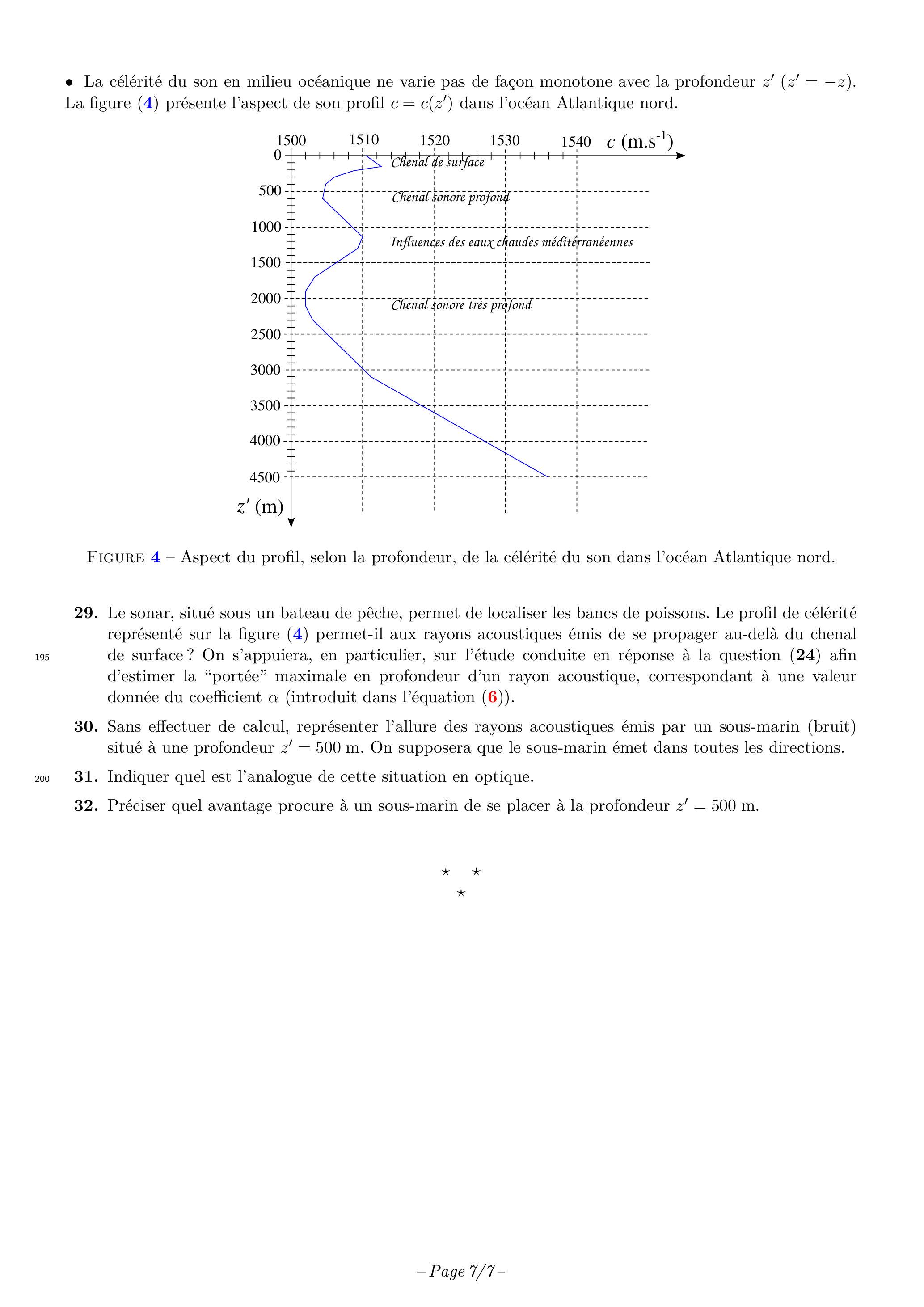 Le sonar, situé sous un bateau de pêche, permet de localiser les bancs de poissons. Le profil de célérité représenté sur la figure (4) permet-il aux rayons acoustiques émis de se propager au-delà du chenal de surface? On s'appuiera, en particulier, sur l'étude conduite en réponse à la question (24) afin d'estimer la "portée" maximale en profondeur d'un rayon acoustique, correspondant à une valeur donnée du coefficient (introduit dans l'équation (6)).