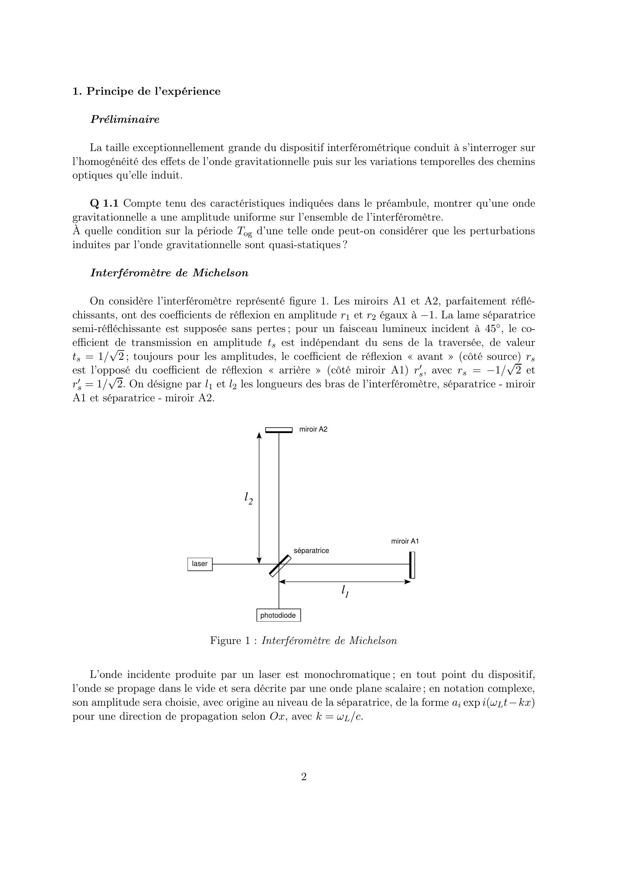 Q 1.1 Compte tenu des caractéristiques indiquées dans le préambule, montrer qu'une onde gravitationnelle a une amplitude uniforme sur l'ensemble de l'interféromètre. À quelle condition sur la période d'une telle onde peut-on considérer que les perturbations induites par l'onde gravitationnelle sont quasi-statiques?