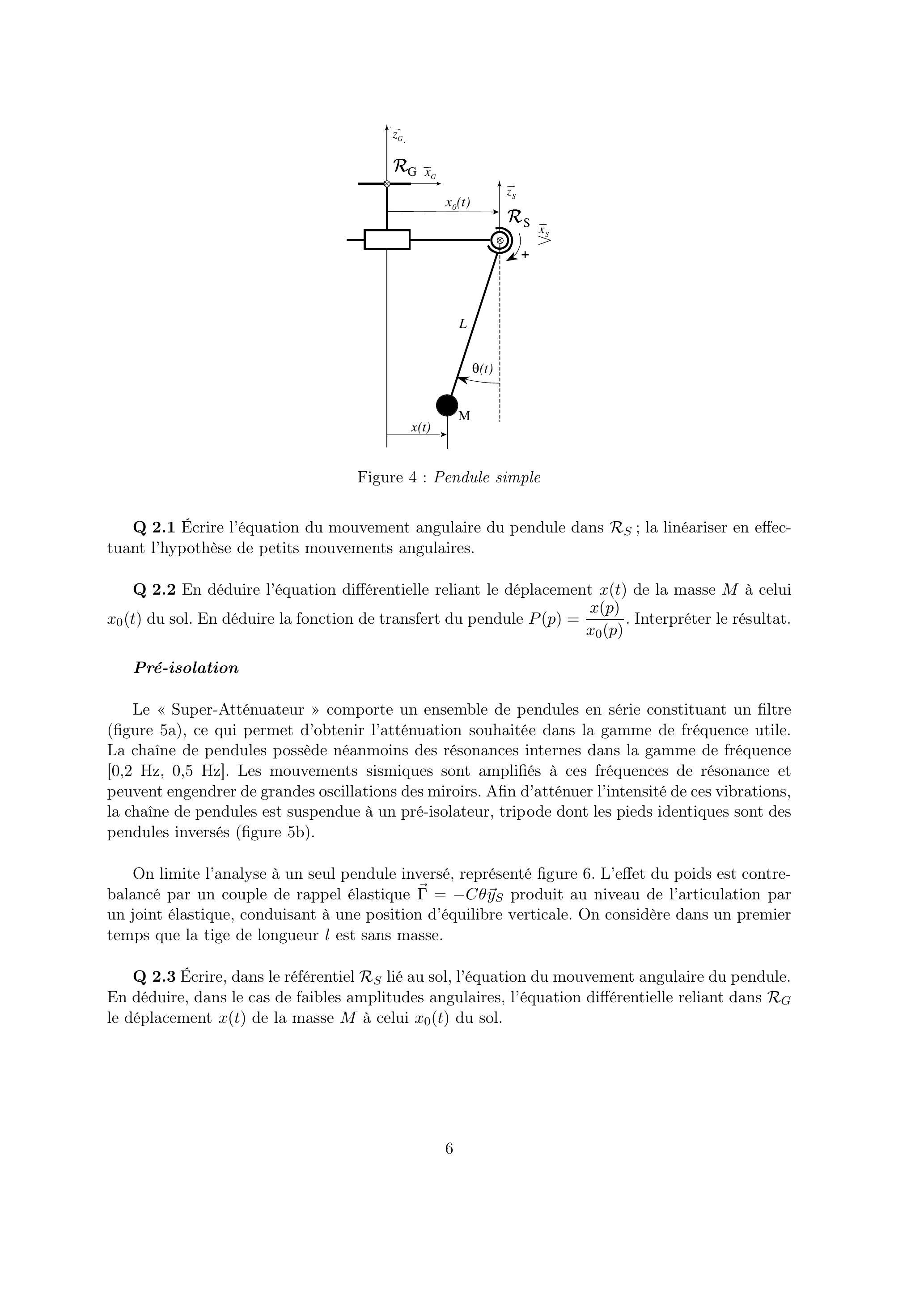 Q 2.3 Écrire, dans le référentiel lié au sol, l'équation du mouvement angulaire du pendule. En déduire, dans le cas de faibles amplitudes angulaires, l'équation différentielle reliant dans le déplacement de la masse à celui du sol.