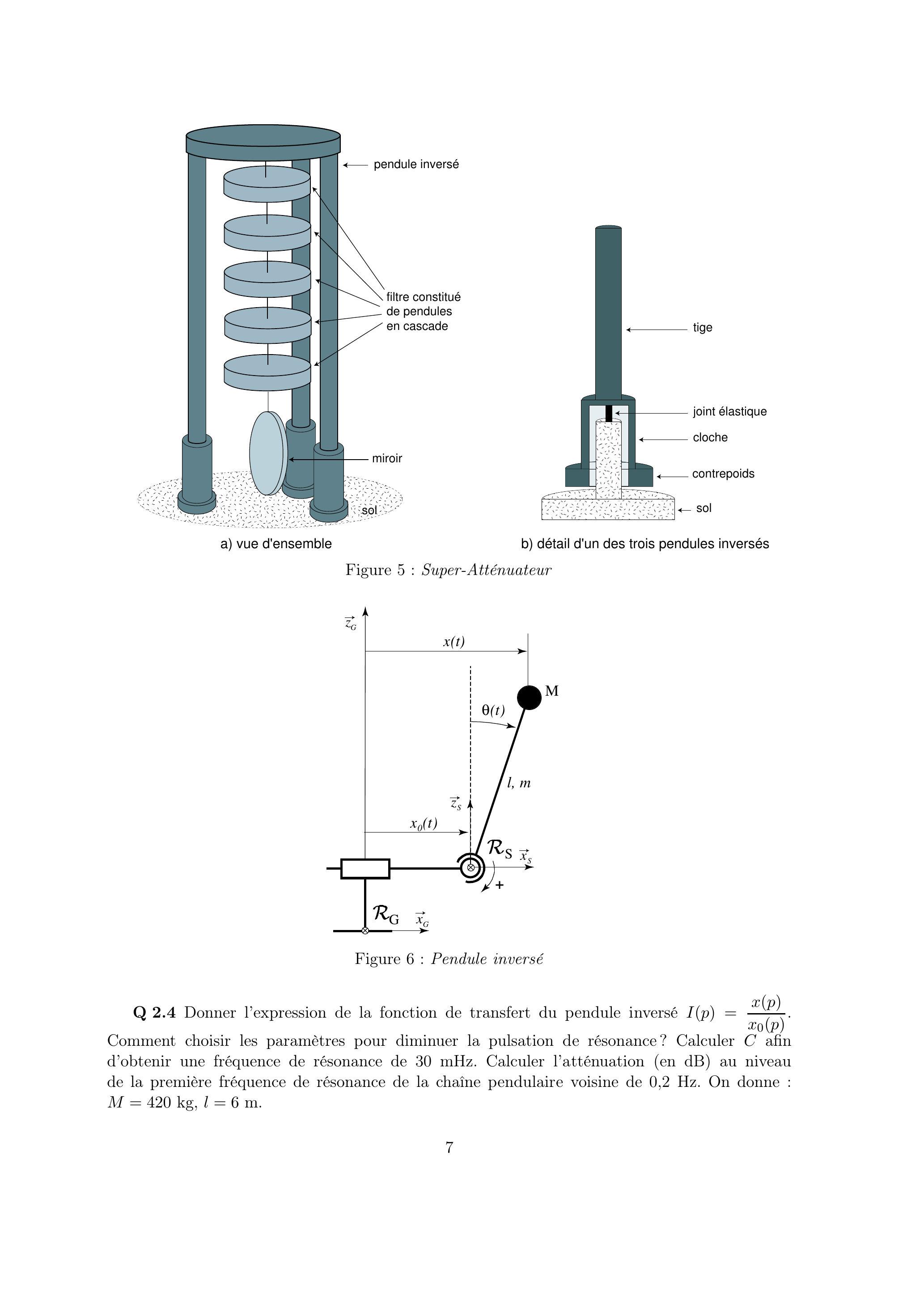 Q 2.4 Donner l'expression de la fonction de transfert du pendule inversé . Comment choisir les paramètres pour diminuer la pulsation de résonance? Calculer afin d'obtenir une fréquence de résonance de 30 mHz . Calculer l'atténuation (en dB) au niveau de la première fréquence de résonance de la chaîne pendulaire voisine de . On donne : .