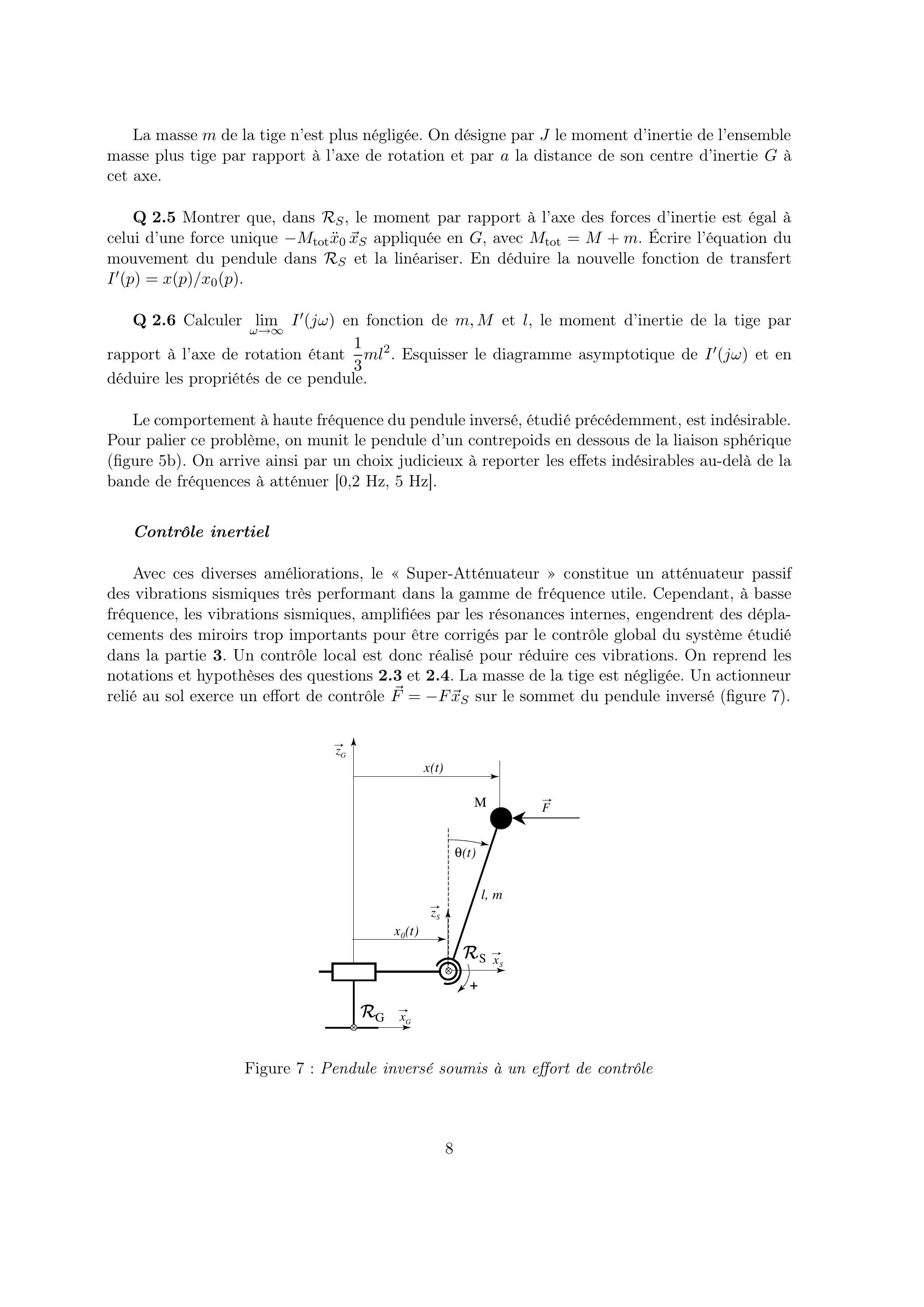 Avec ces diverses améliorations, le «Super-Atténuateur » constitue un atténuateur passif des vibrations sismiques très performant dans la gamme de fréquence utile. Cependant, à basse fréquence, les vibrations sismiques, amplifiées par les résonances internes, engendrent des déplacements des miroirs trop importants pour être corrigés par le contrôle global du système étudié dans la partie 3. Un contrôle local est donc réalisé pour réduire ces vibrations. On reprend les notations et hypothèses des questions 2.3 et . La masse de la tige est négligée. Un actionneur relié au sol exerce un effort de contrôle sur le sommet du pendule inversé (figure 7).