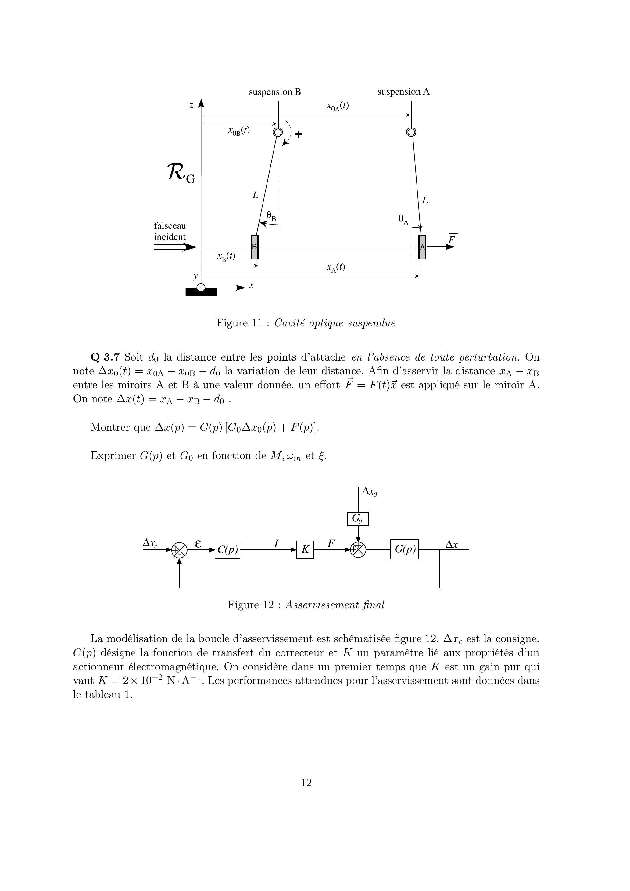 On étudie l'asservissement en position de l'un des miroirs suspendus A , situé à l'extrémité d'un bras de l'interféromètre. Le but de cet asservissement est de maintenir constant la distance entre le miroir d'entrée (miroir B ) et le miroir d'extrémité (miroir A ) pour que la cavité kilométrique reste proche du réglage défini à la question : avec entier. La fréquence du laser étant supposée fixée, le signal d'erreur décrit dans les questions précédentes permet de mesurer les variations de la distance entre les deux miroirs A et B. Pour simplifier l'étude, chaque miroir est assimilé à un pendule simple amorti de masse , de pulsation propre . On note respectivement et les positions des miroirs A et et celles de leur point d'attache, évaluées algébriquement selon l'axe du faisceau incident (figure 11). L'amortissement de chaque miroir est modélisé par l'introduction, dans l'équation de son mouvement, d'un terme en ou , avec un paramètre d'amortissement .