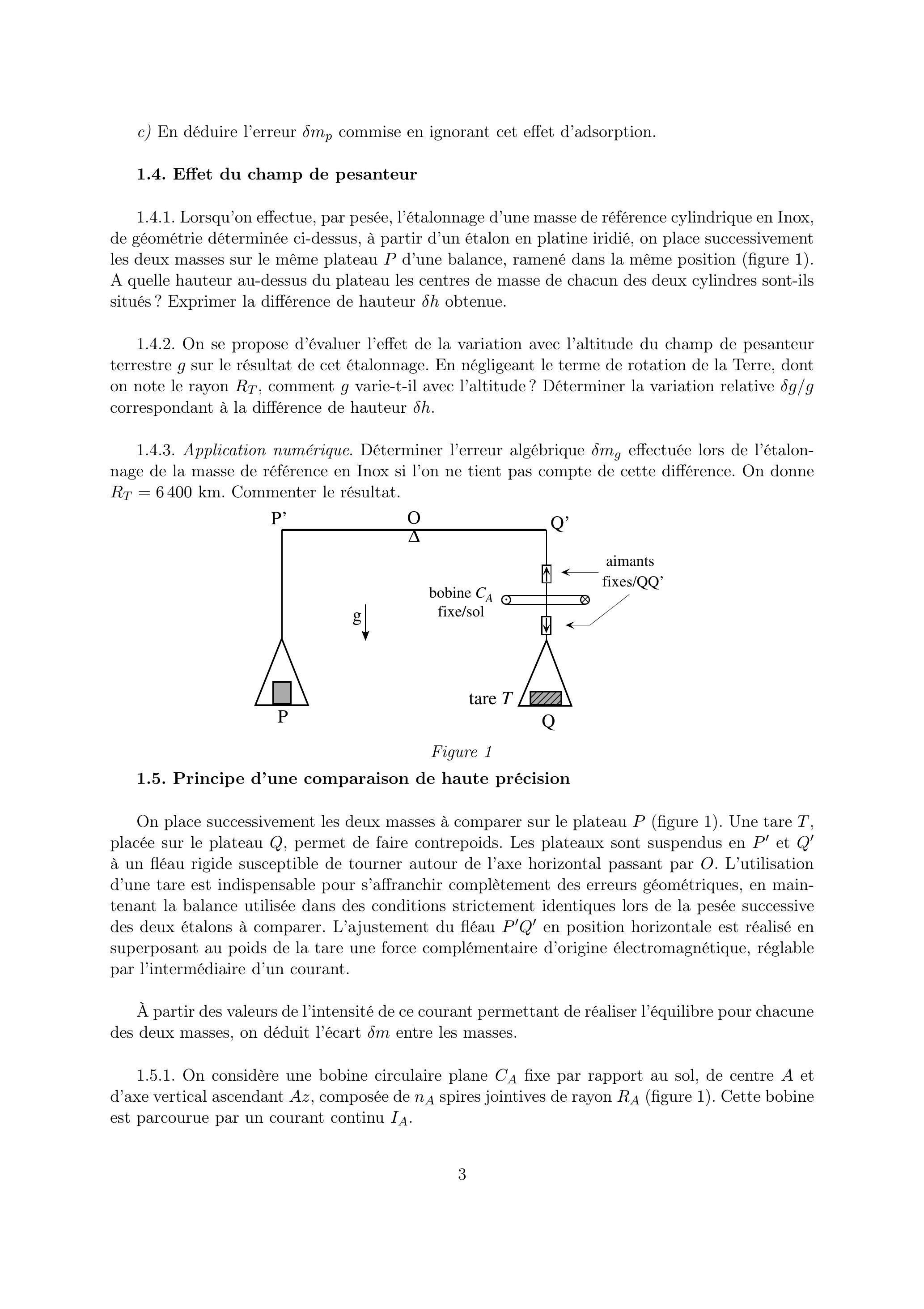 2.3.3. En pratique, on décompose la phase statique en deux. Un premier équilibre est réalisé sans la masse , mais en ajoutant à la tare une masse voisine de ; l'équilibre est rétabli pour une intensité ; le second avec l'est pour une intensité . Montrer que ces deux intensités sont de sens opposés et écrire la relation qui remplace celle de 2.2.2. Quel est l'intérêt de ce mode opératoire?