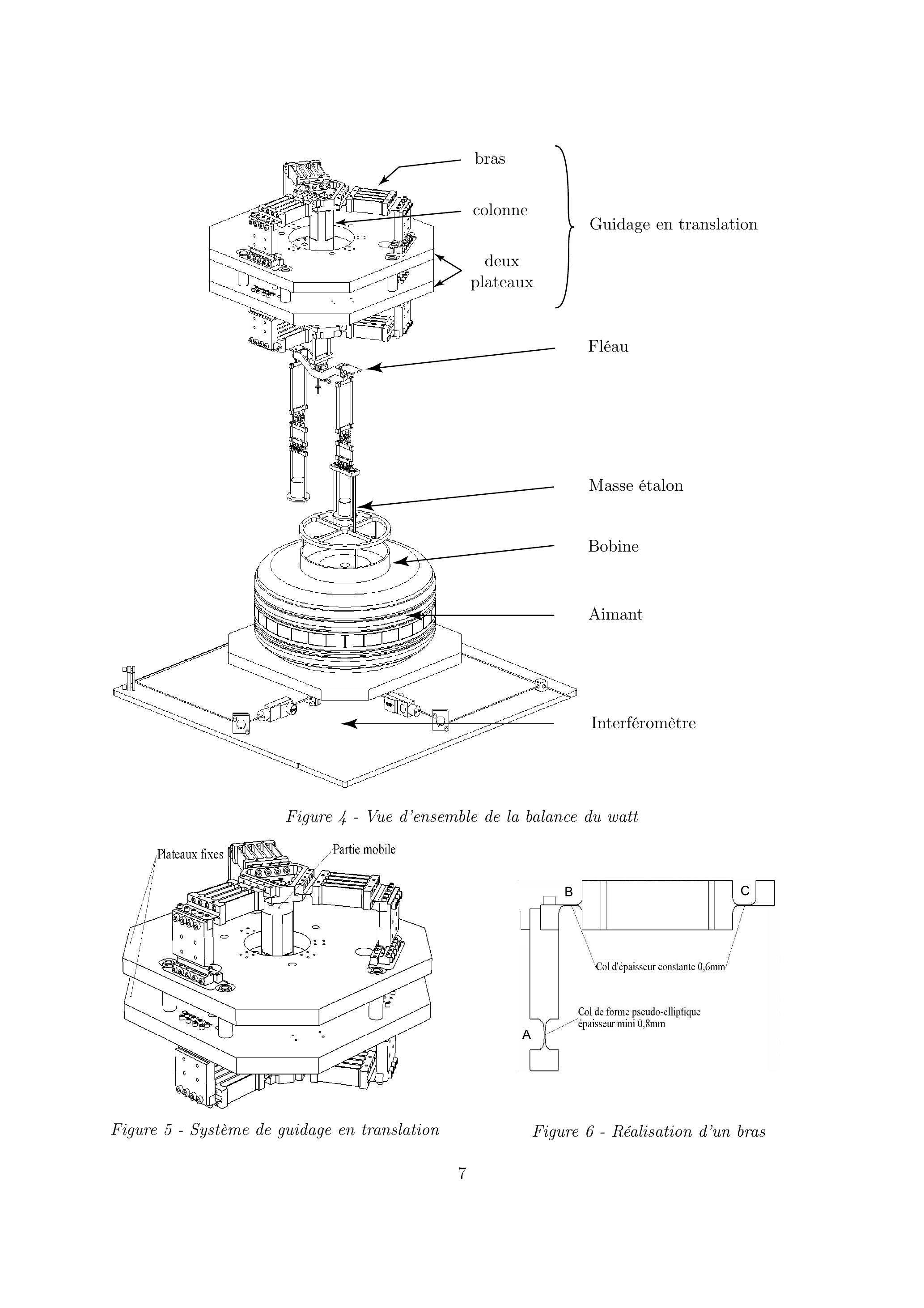 Une réalisation de la balance du watt est montrée sur la figure 4. En partie supérieure, les deux plateaux qui supportent les bras de guidage de la colonne centrale sont liés à un bâti non représenté sur la figure. Le fléau est suspendu à la colonne par une articulation sans jeu et sans frottement et un capteur en mesure la position angulaire. À l'extrémité de chacun de ses deux bras est accroché un plateau qui permet de poser les masses. L'un d'eux est lié à la bobine qui plonge dans l'aimant placé en partie basse sur un plateau de mesure par interférométrie.