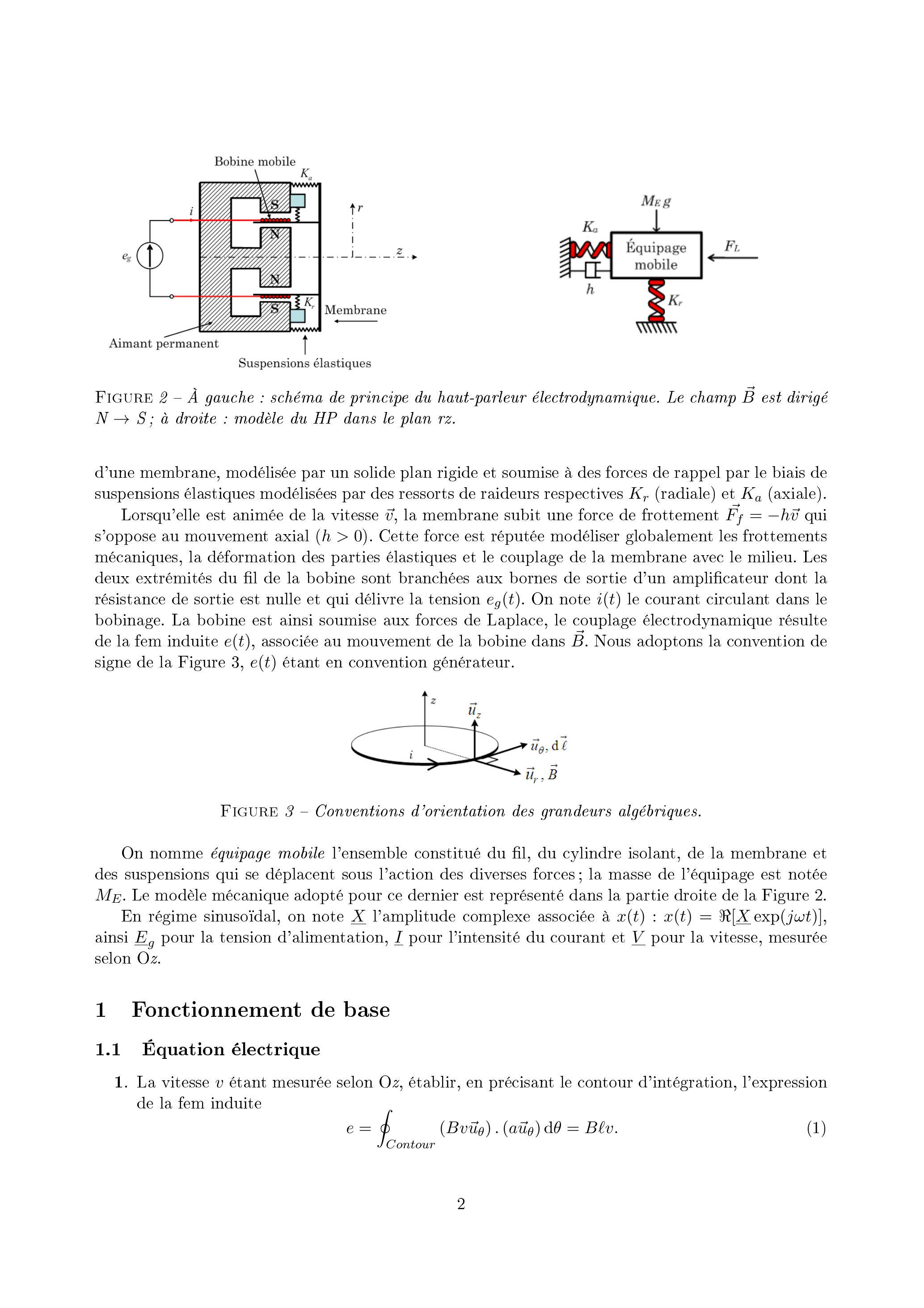 Le haut-parleur électrodynamique (Figures 1 et 2 ) est principalement constitué d'un aimant permanent et d'une bobine mobile enroulée sur un cylindre en matériau isolant et assujettie à se déplacer dans la direction axiale, notée . L'aimant, dont les pôles sont deux cylindres concentriques, génère une induction magnétique radiale ( est le vecteur radial unitaire) de module uniforme au niveau du périmètre des spires de la bobine. Cette bobine est modélisée par un ensemble de spires circulaires identiques fermées de rayon , parcourues par le même courant. On note la longueur du fil soumis à sa résistance et son inductance propre. Cette bobine est solidaire
