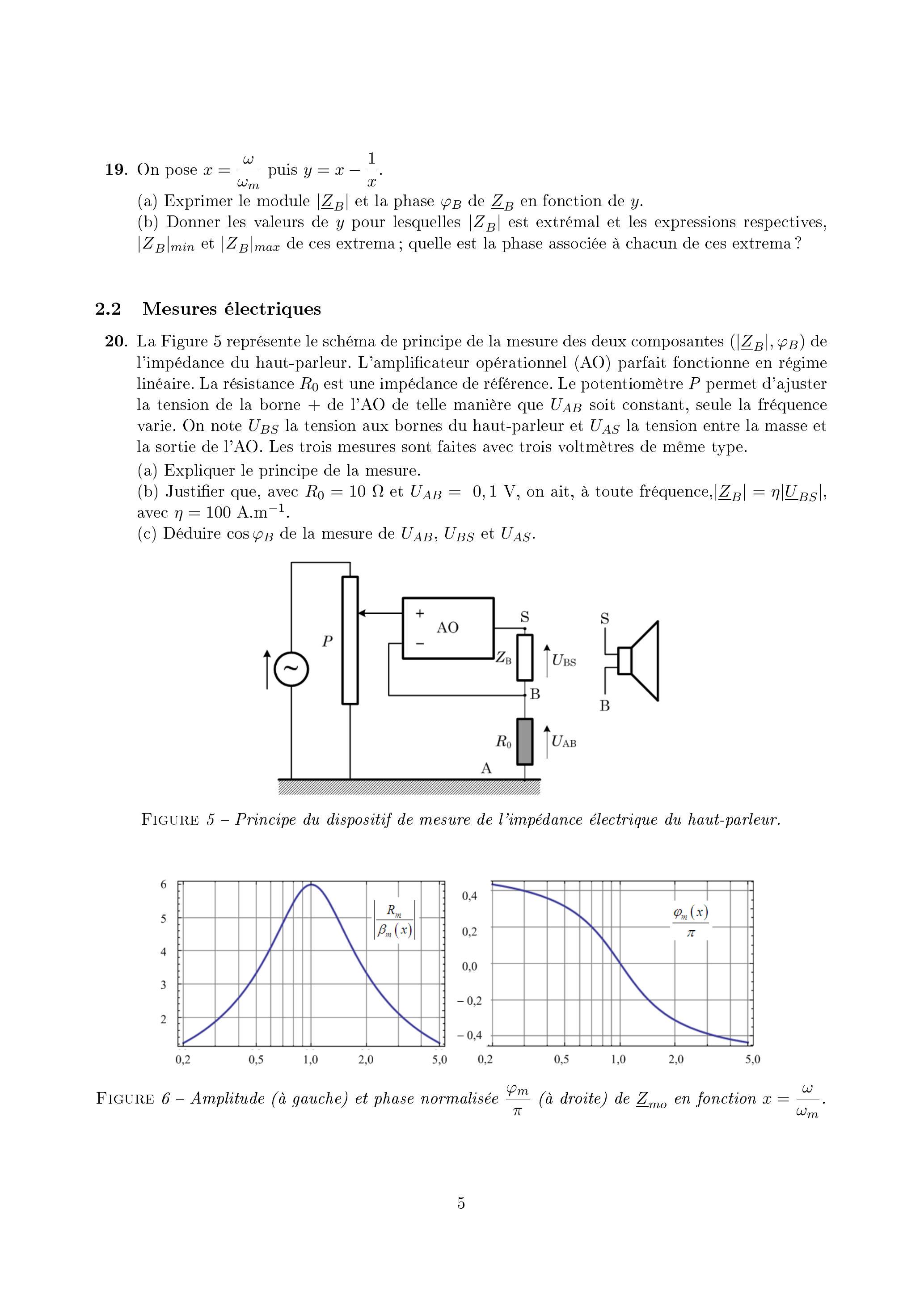 La Figure 5 représente le schéma de principe de la mesure des deux composantes ( ) de l'impédance du haut-parleur. L'amplificateur opérationnel (AO) parfait fonctionne en régime linéaire. La résistance est une impédance de référence. Le potentiomètre permet d'ajuster la tension de la borne + de l'AO de telle manière que soit constant, seule la fréquence varie. On note la tension aux bornes du haut-parleur et la tension entre la masse et la sortie de l'AO. Les trois mesures sont faites avec trois voltmètres de même type.