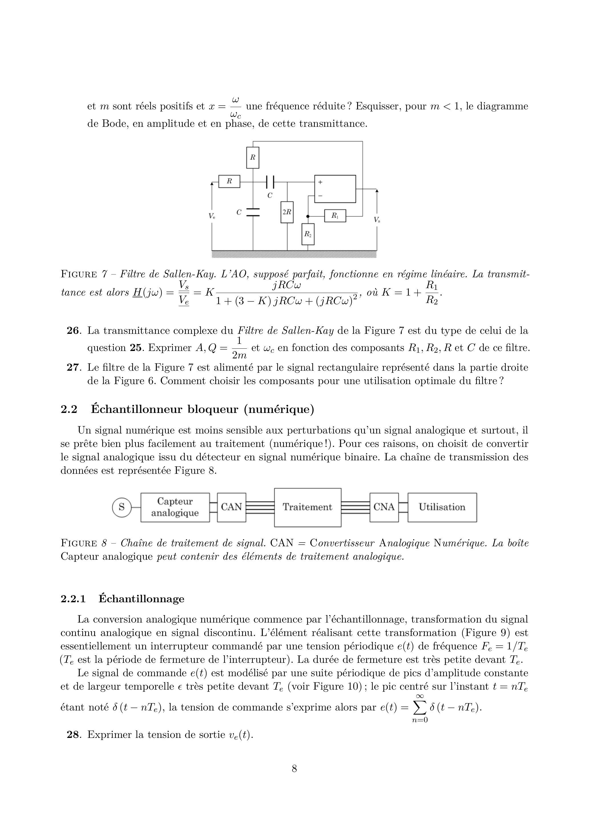 La transmittance complexe du Filtre de Sallen-Kay de la Figure 7 est du type de celui de la question 25. Exprimer et en fonction des composants et de ce filtre.
