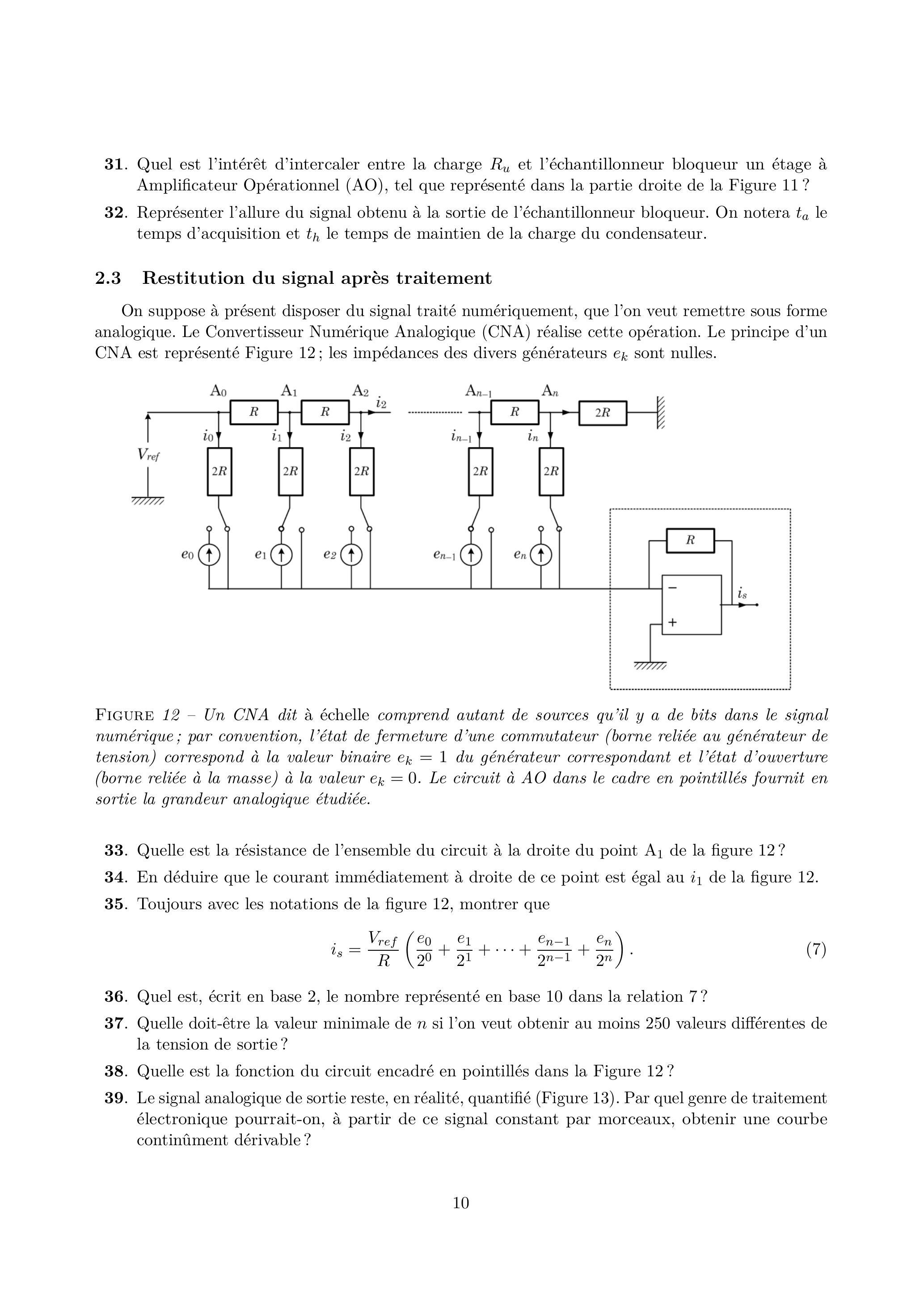 On suppose à présent disposer du signal traité numériquement, que l'on veut remettre sous forme analogique. Le Convertisseur Numérique Analogique (CNA) réalise cette opération. Le principe d'un CNA est représenté Figure 12; les impédances des divers générateurs sont nulles.