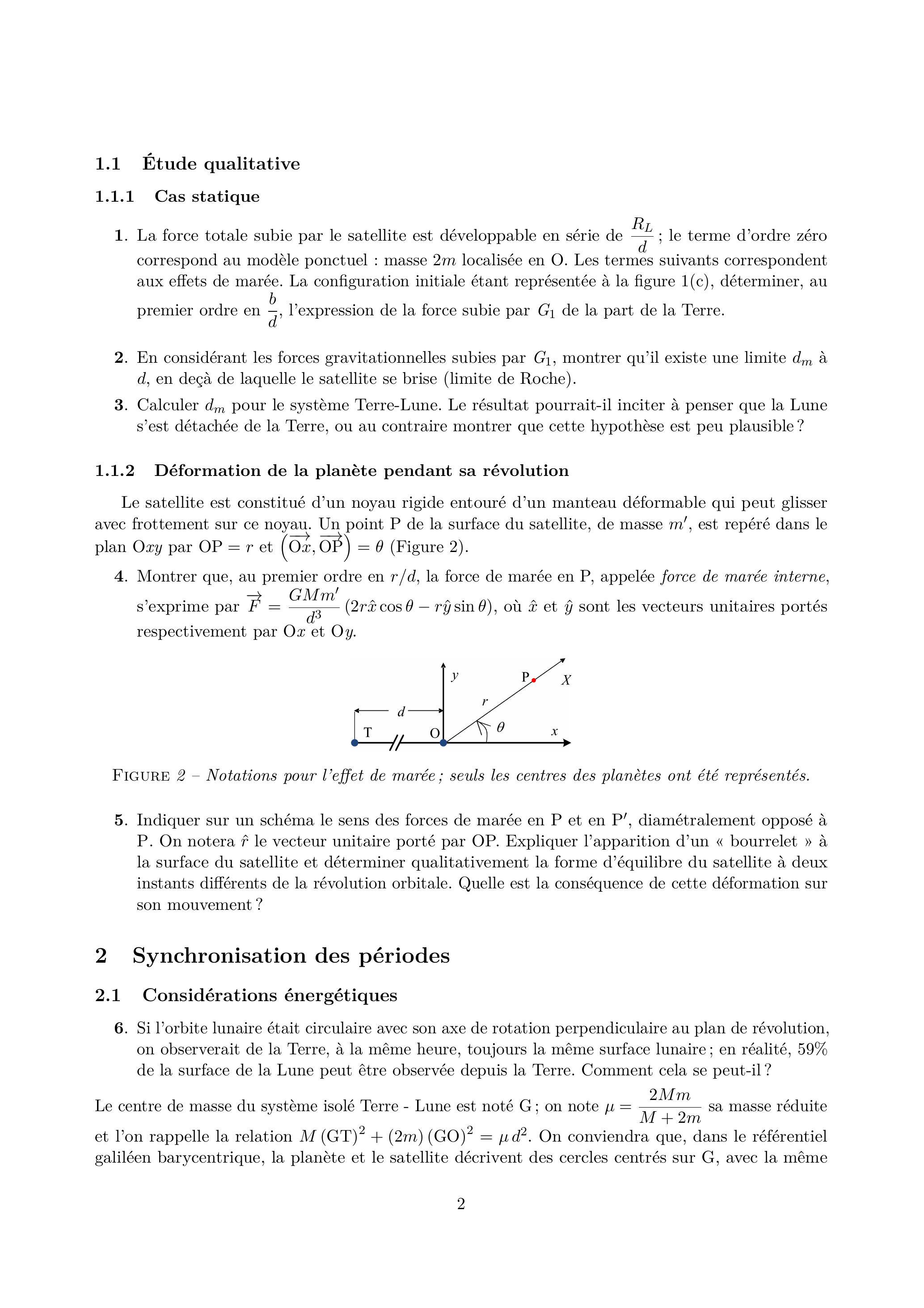 Le centre de masse du système isolé Terre - Lune est noté G ; on note sa masse réduite et l'on rappelle la relation . On conviendra que, dans le référentiel galiléen barycentrique, la planète et le satellite décrivent des cercles centrés sur G , avec la même