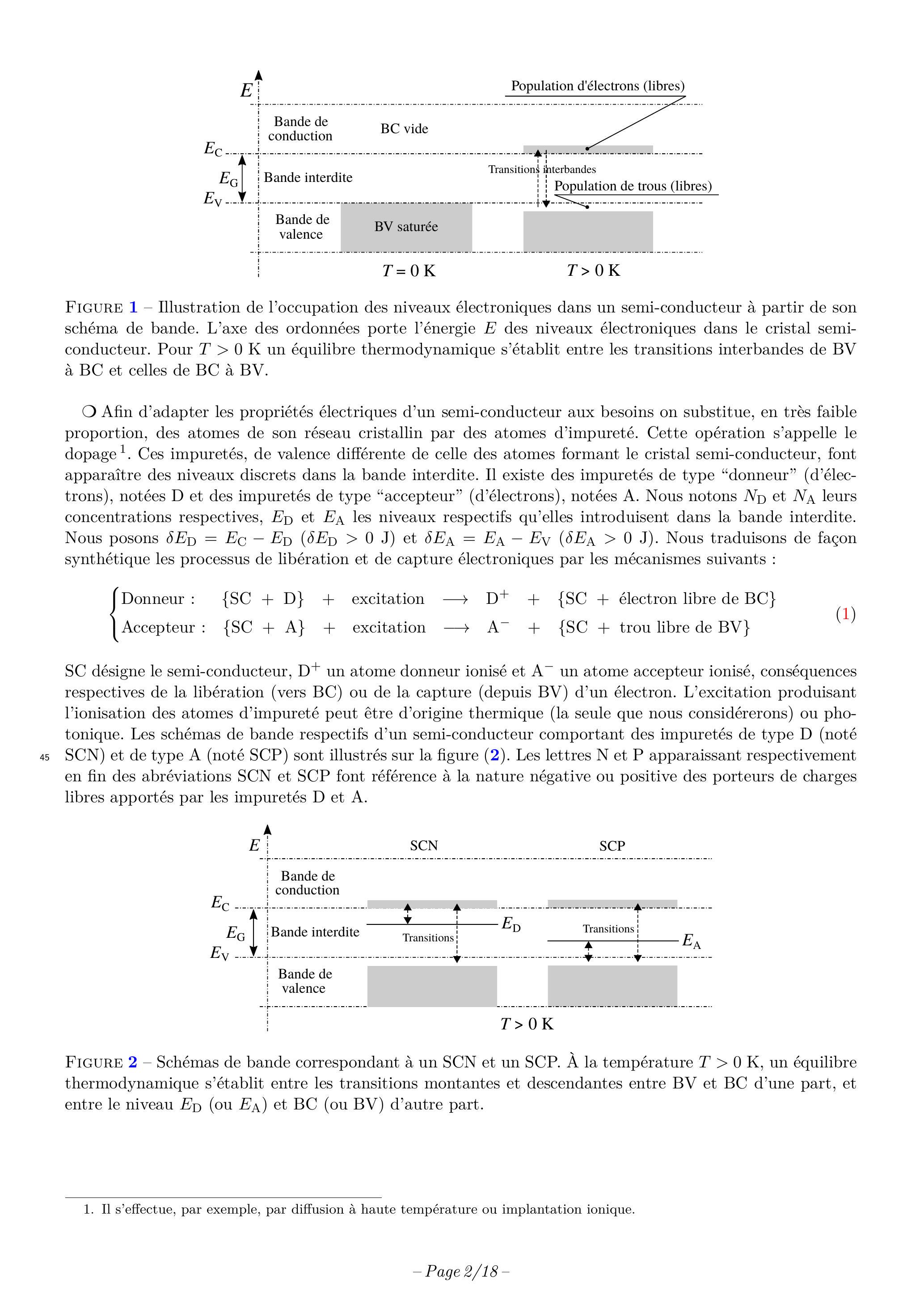 Cette étude comprend trois parties. La première est consacrée à la caractérisation d'un semi-conducteur. La deuxième s'intéresse au principe de la diode et la troisième à celui du transistor bipolaire. Cette dernière partie porte essentiellement sur l'étude d'une structure amplificatrice de tension élémentaire. La deuxième partie est étroitement liée à la première. L'étude de la structure amplificatrice peut être abordée de façon indépendante des études précédentes. Les applications numériques seront effectuées avec la précision qu'un calcul à la main permet aisément, et sans excéder deux chiffres significatifs. Les ordres de grandeur seront donnés avec un seul chiffre significatif. Les réponses aux questions relevant de considérations qualitatives devront être argumentées. Les références des questions abordées devront être indiquées de façon claire.