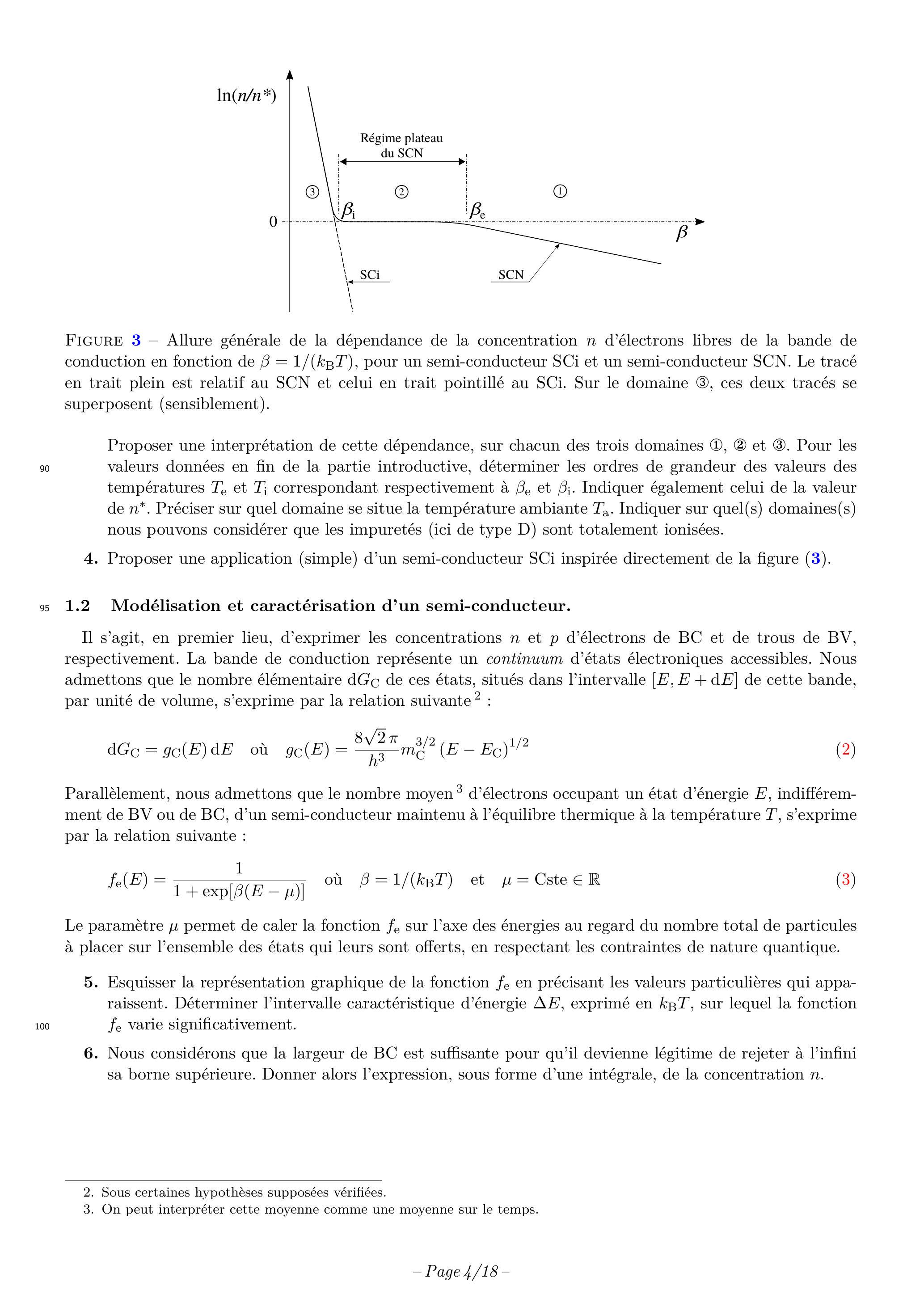 Proposer une interprétation de cette dépendance, sur chacun des trois domaines (1), (2) et (3). Pour les valeurs données en fin de la partie introductive, déterminer les ordres de grandeur des valeurs des températures et correspondant respectivement à et . Indiquer également celui de la valeur de . Préciser sur quel domaine se situe la température ambiante . Indiquer sur quel(s) domaines(s) nous pouvons considérer que les impuretés (ici de type D ) sont totalement ionisées.